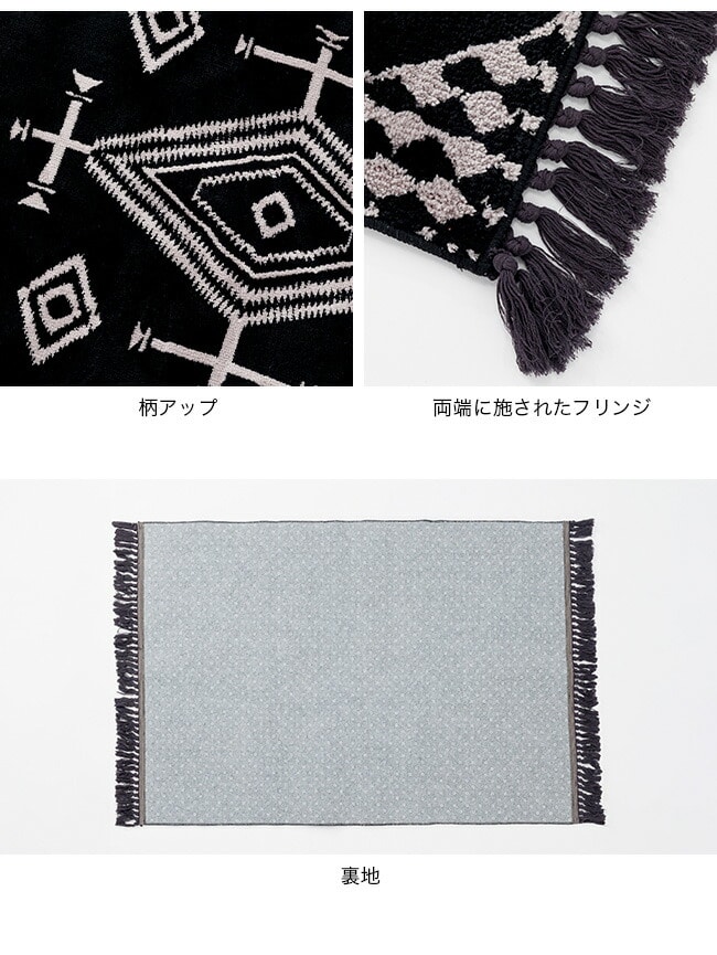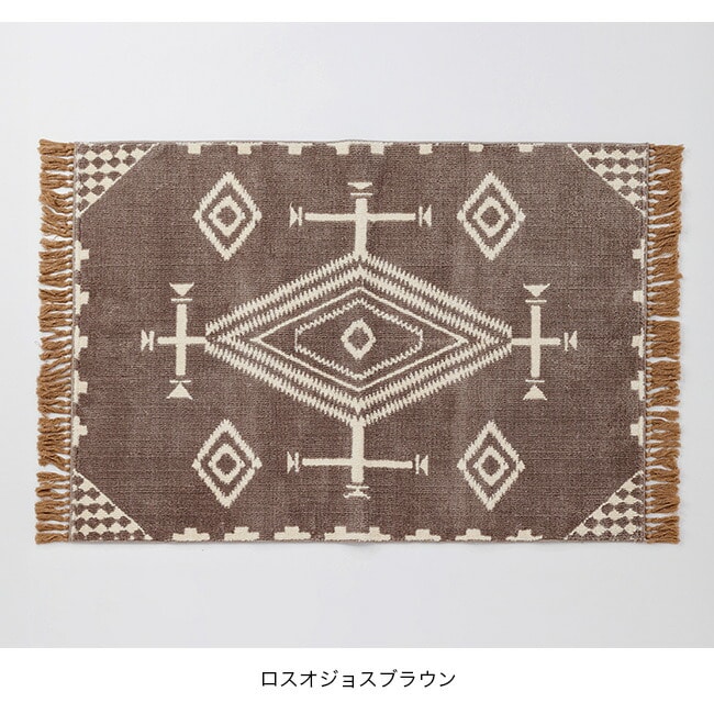 両端に施されたフリンジがさりげないアクセントとして効いていて、繊細なラインと大胆な幾何学模様が空間に深みを与えます。サイズは90cm×130cmと、玄関やソファ前、ベッドサイドなど使い勝手のいいちょうど良い大きさ。