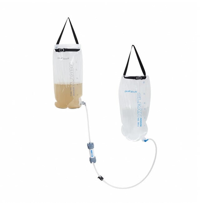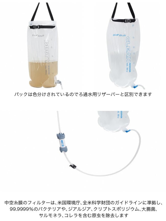 4Lの水を、自然に落下させて浄水します。汚れた水用と清水用のふたつのリザーバー、それを繋ぐホースと中空糸膜のフィルターカートリッジからなるシステムは、シンプルで軽量なのも利点です。