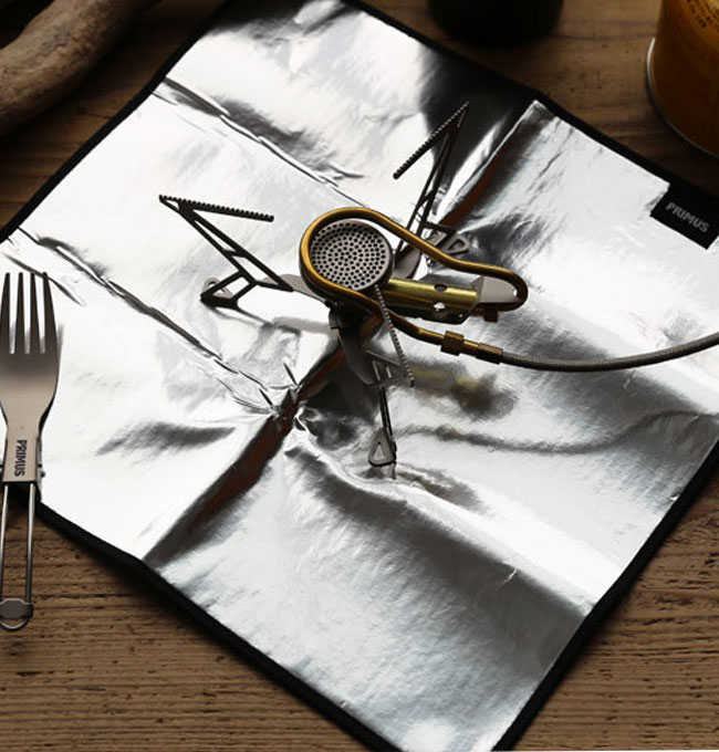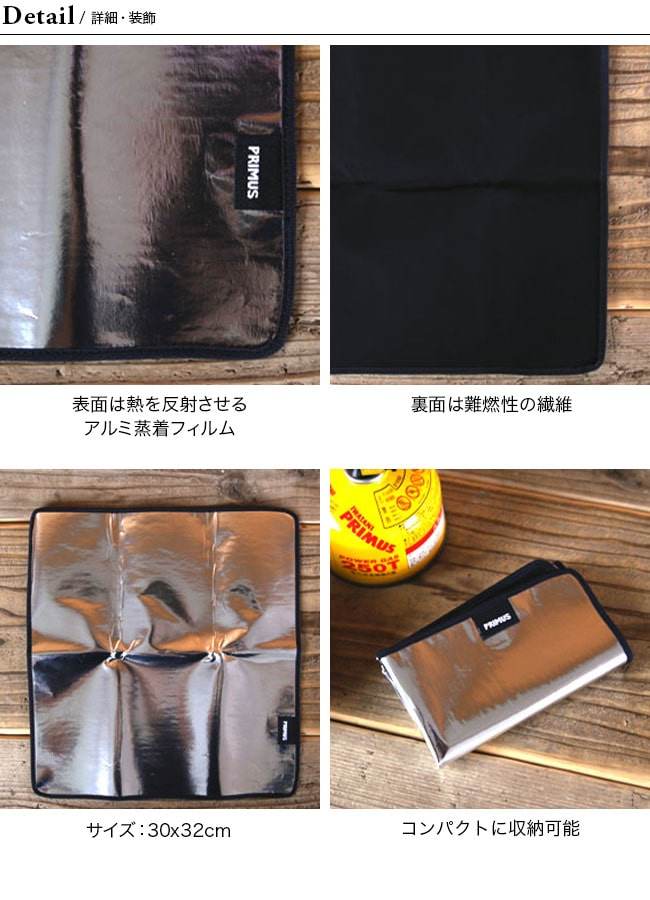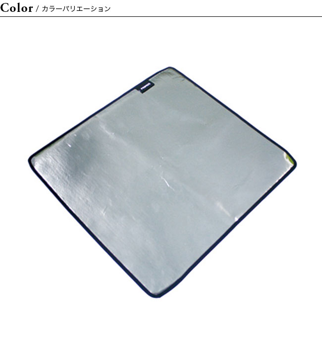 表面には熱を反射させるアルミ蒸着フィルムを、裏面は難燃性の繊維を採用しています。