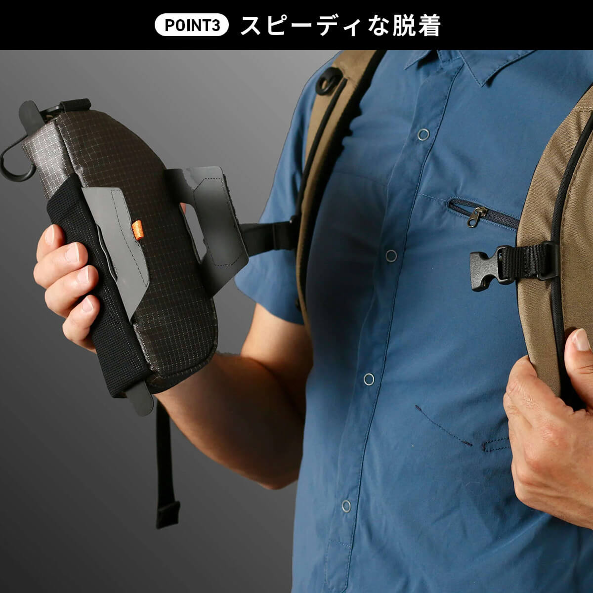 行動中でもバックバックを下ろさずにサッと装着、パックを下ろしてからも簡単に取り外して身につけられる。