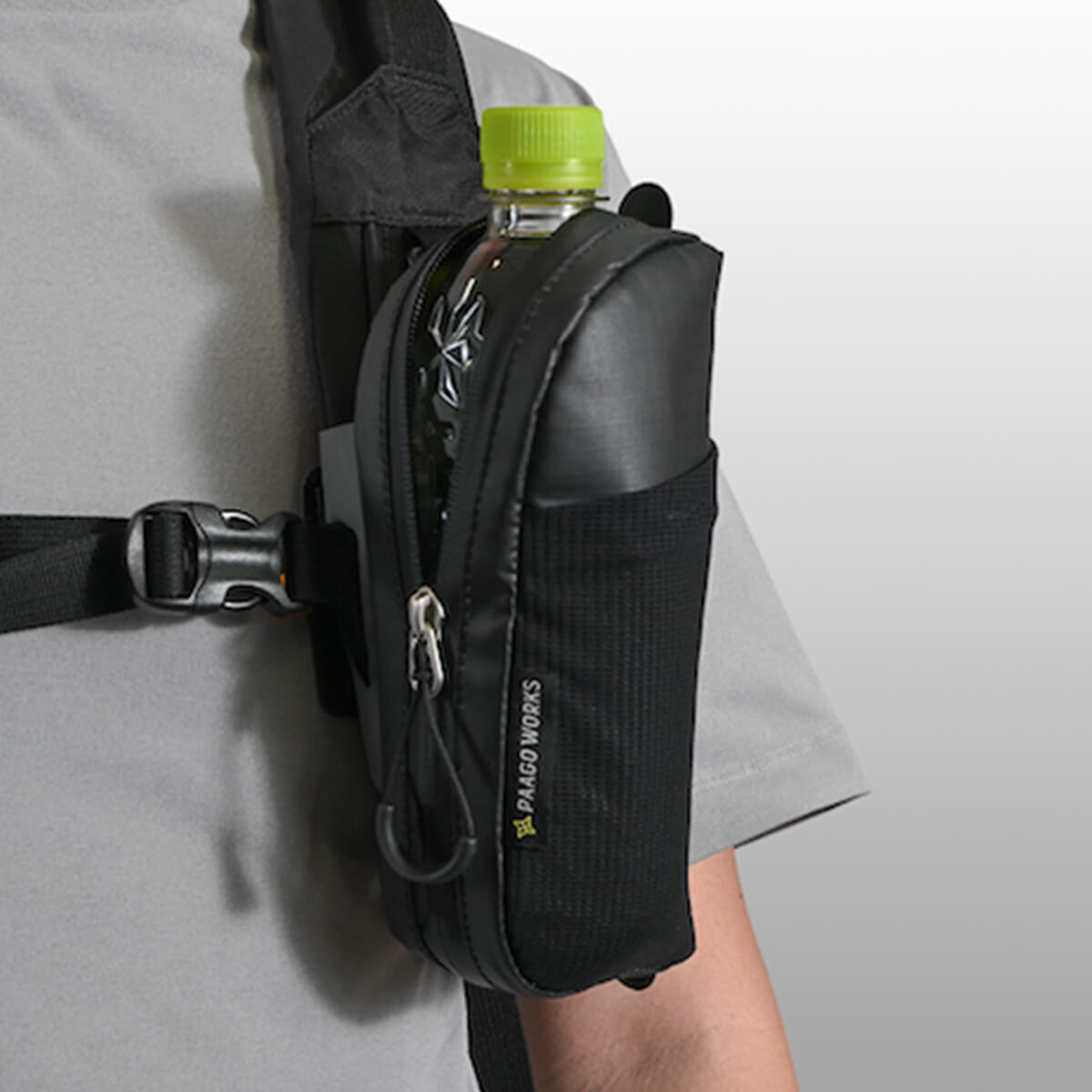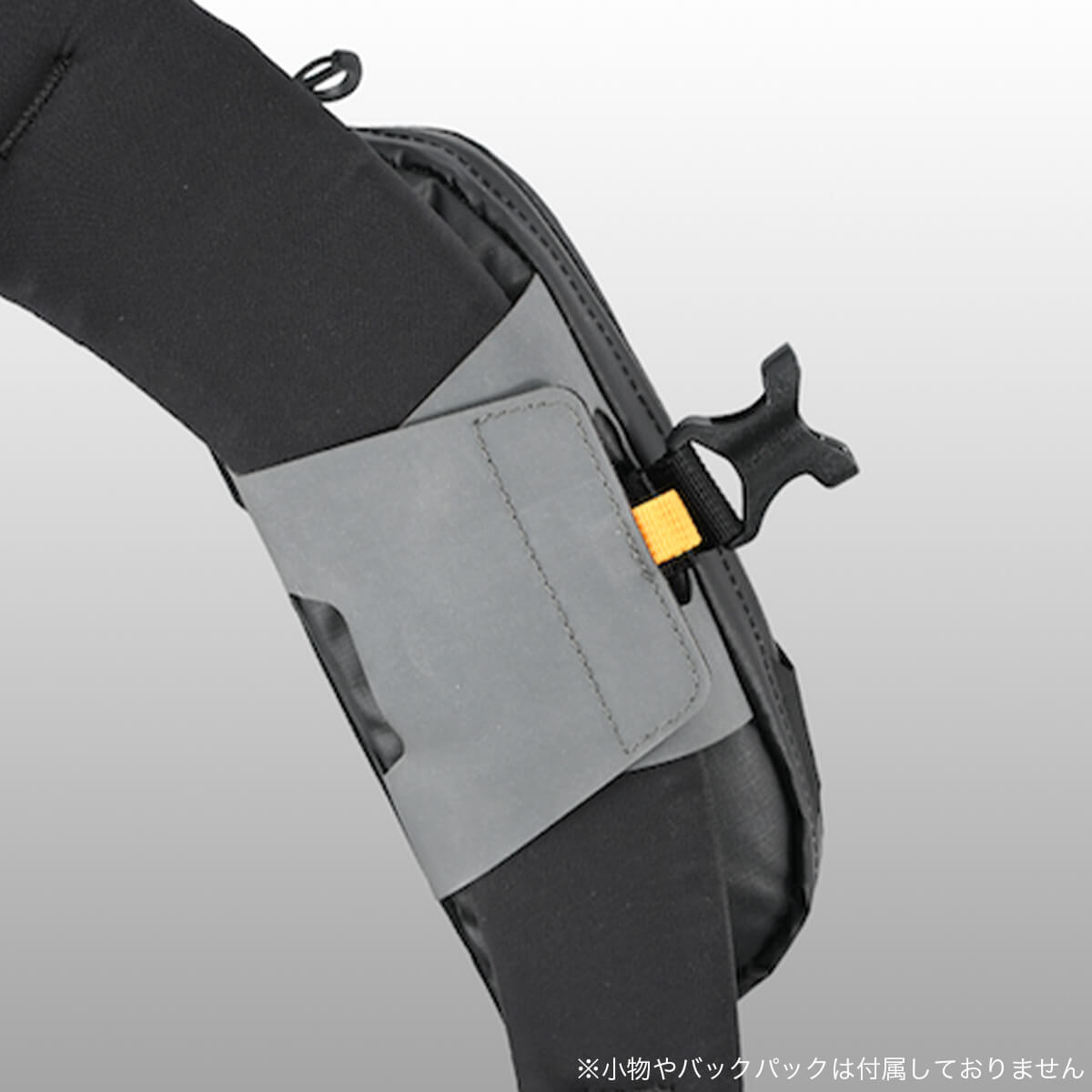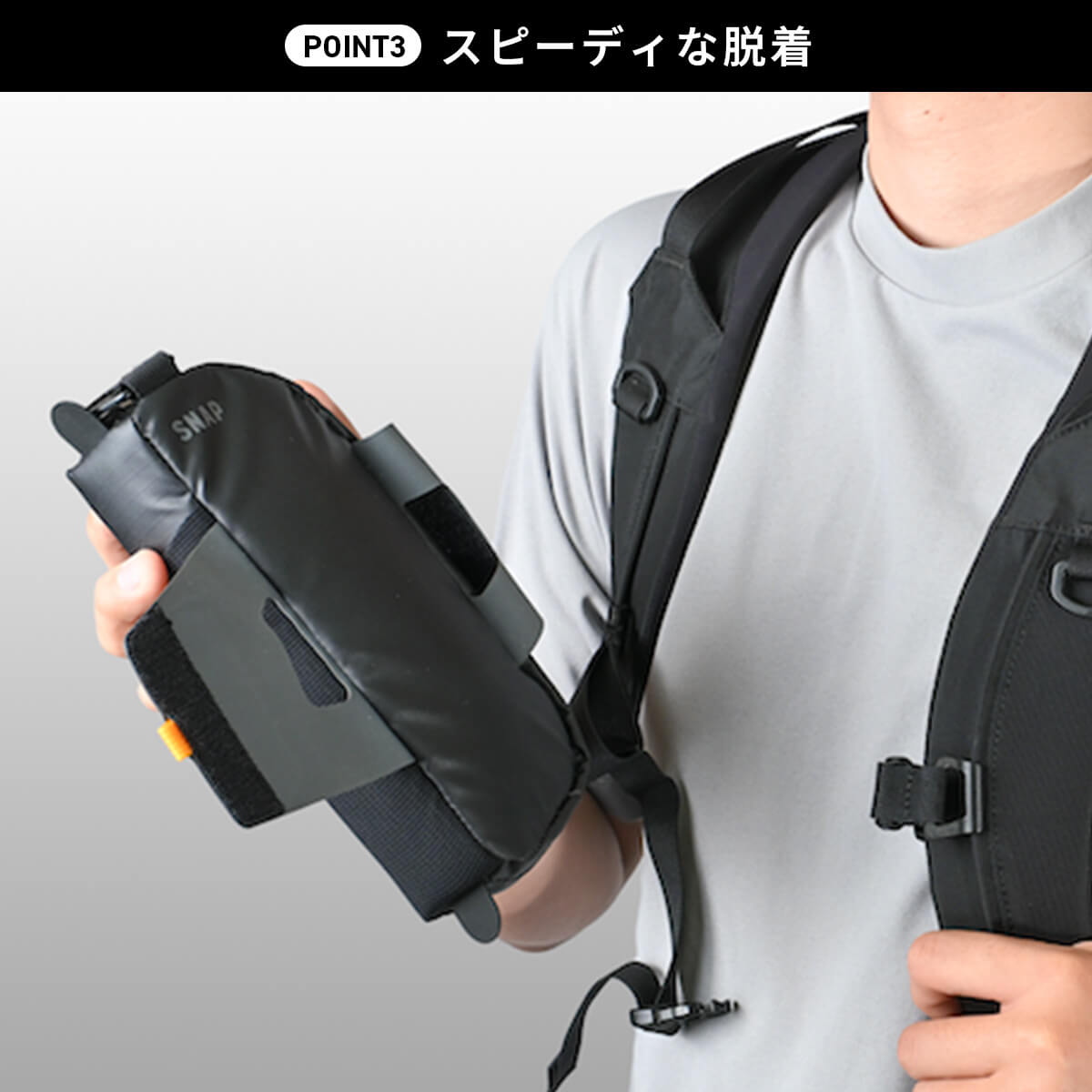 行動中でもバックバックを下ろさずにサッと装着、パックを下ろしてからも簡単に取り外して身につけられる。