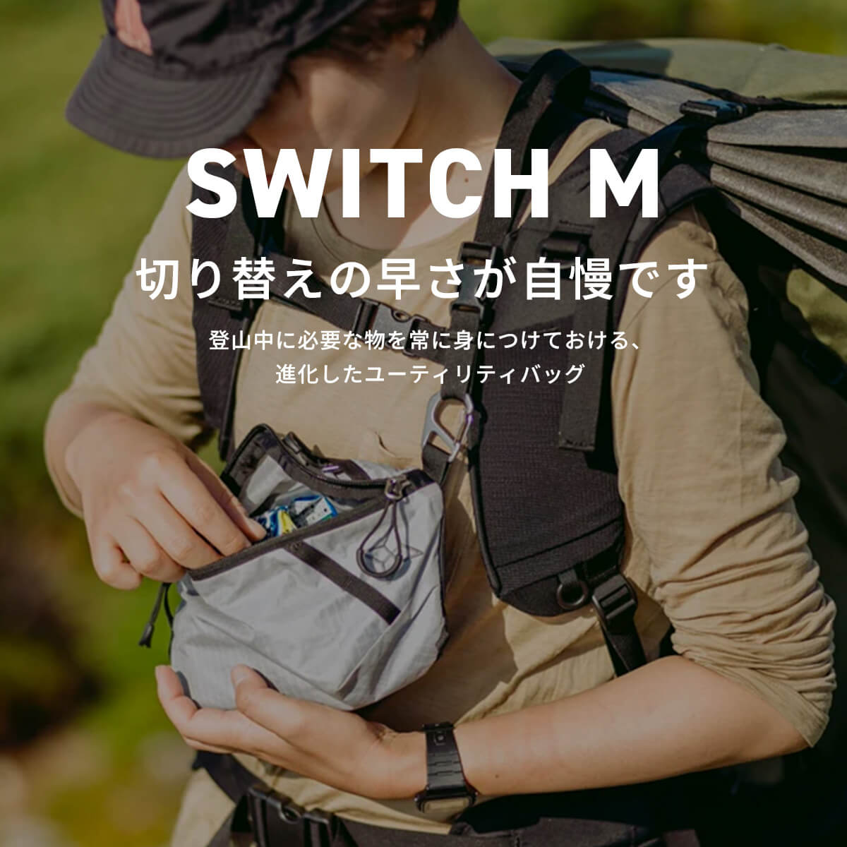 登山に寄り添うバッグとして開発されたのが、このSWITCHです。自慢のアルミフックは、グローブをしていても開閉しやすい大きな開口部と、どこにでも取り付けられる薄さが特徴です。