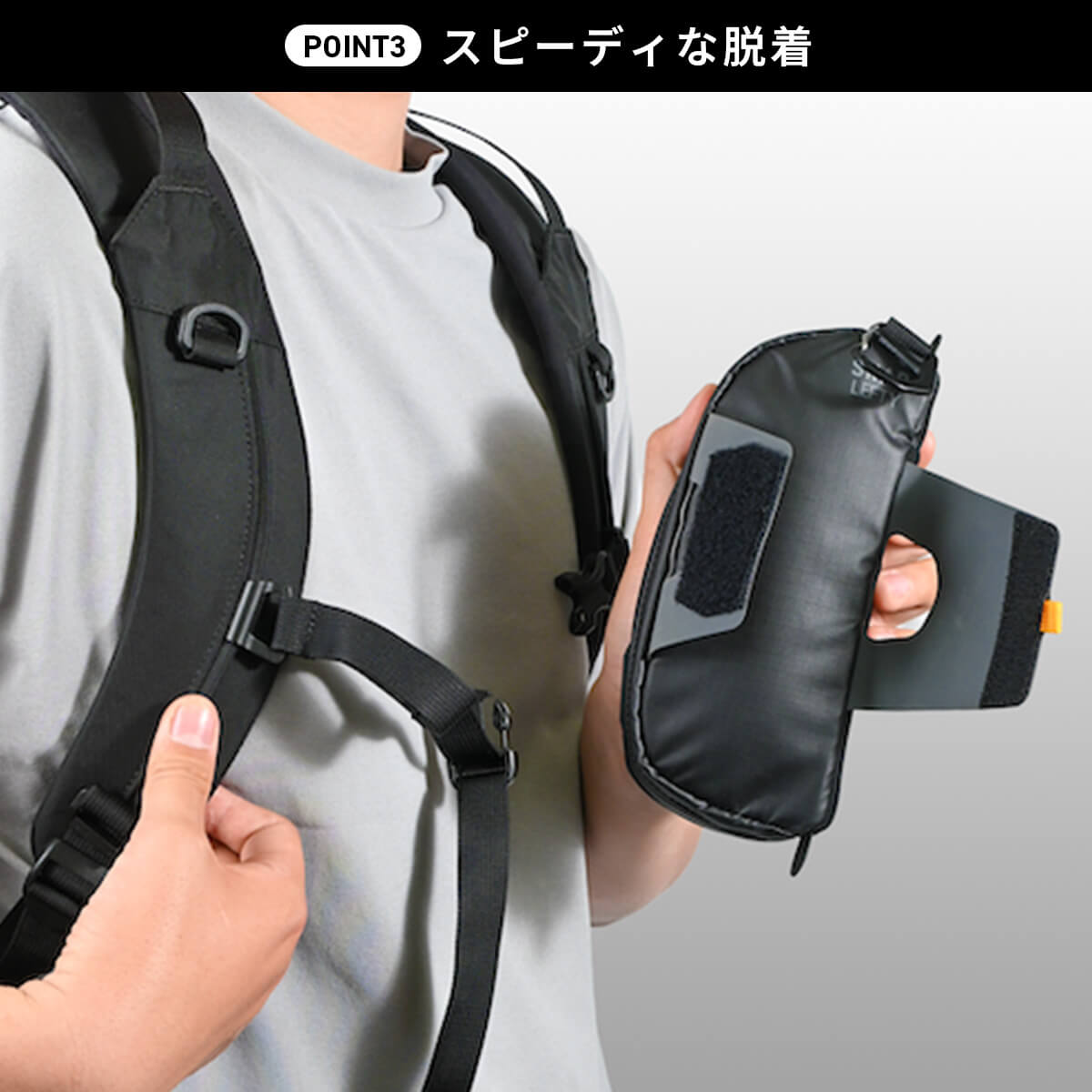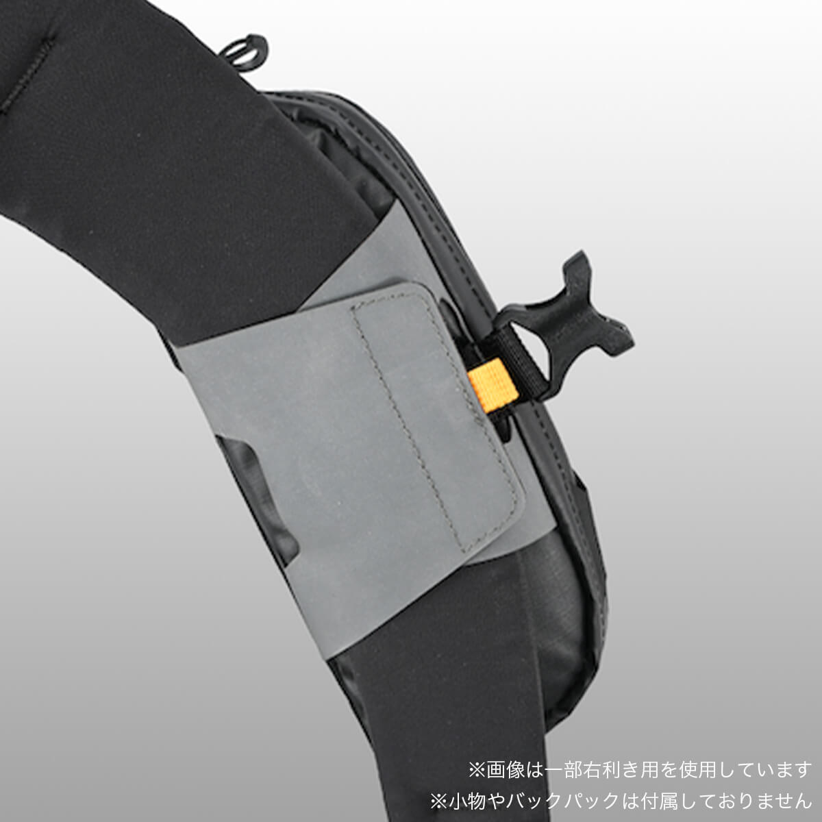バックパックのショルダーハーネスにつけるポーチ「SNAP」の左利き用
