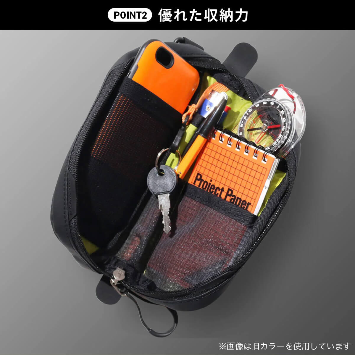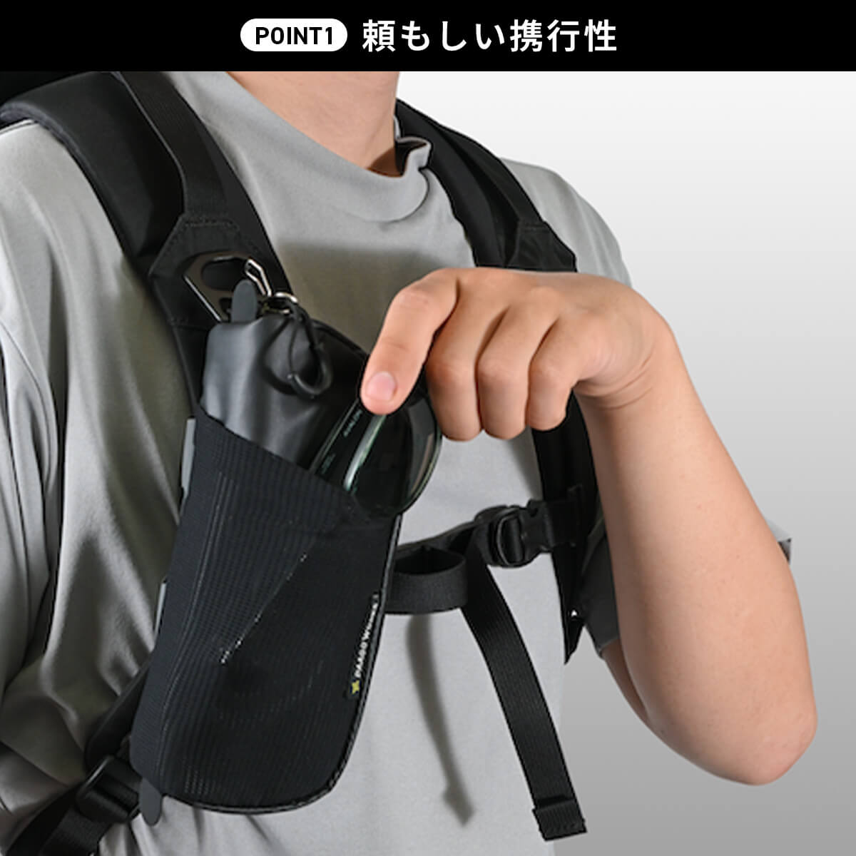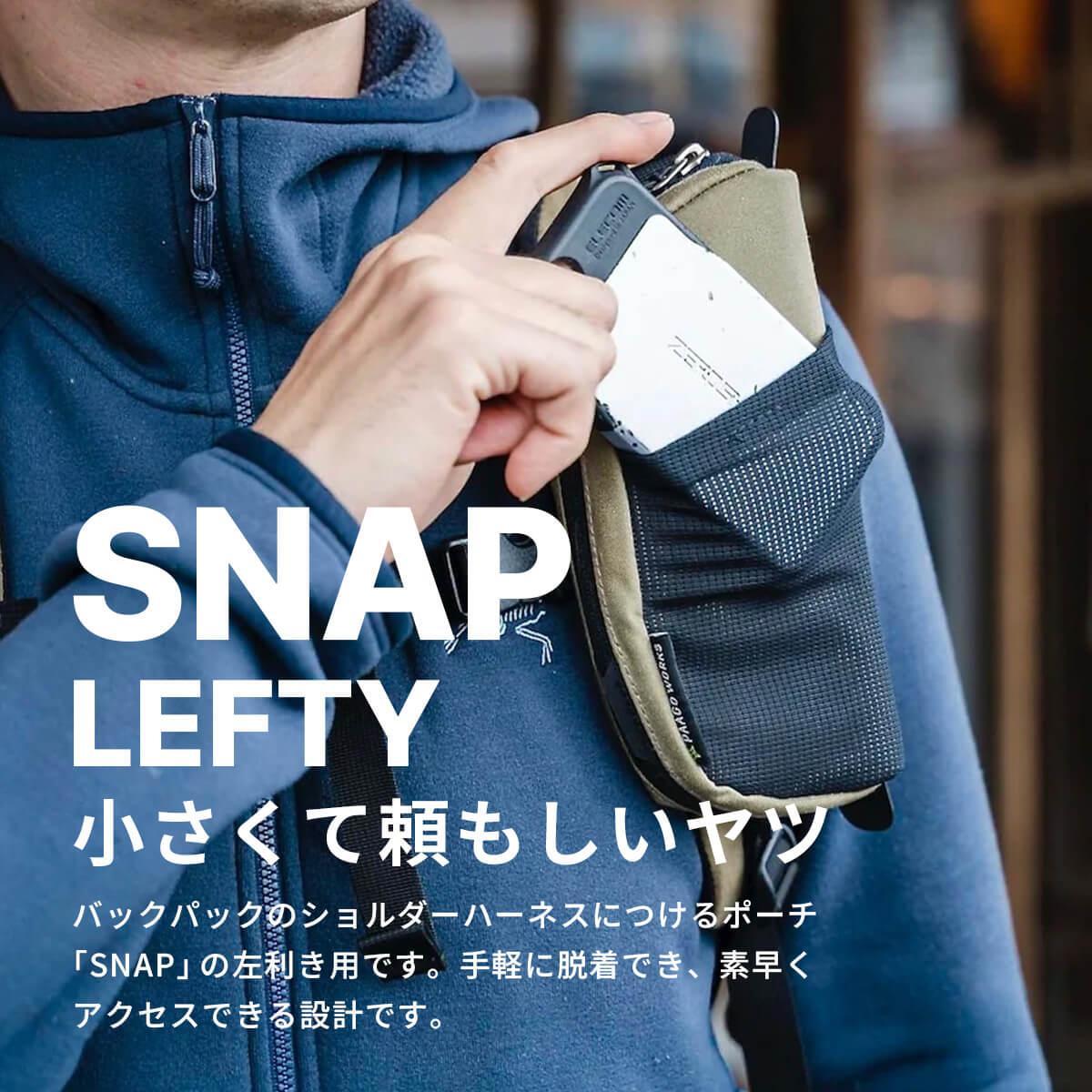 スナップは、バックパックのショルダーハーネスにつけるポーチ。手軽に脱着できるのが特徴で、スマホ・財布・カメラなどの欲しい装備に素早くアクセスできる設計です。