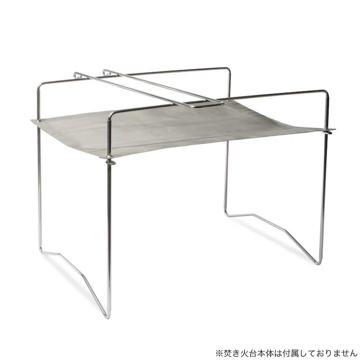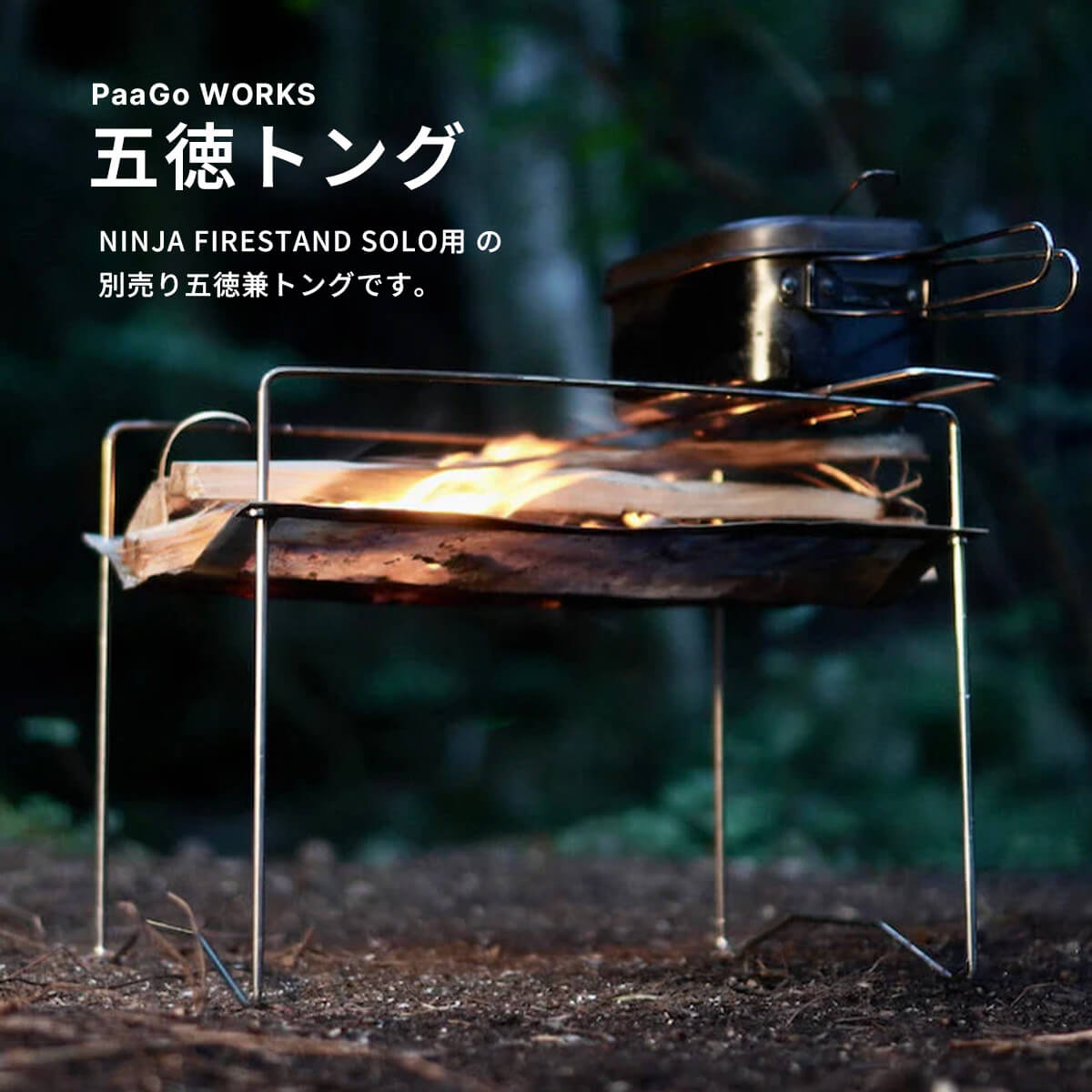 PaaGo WORKSの焚き火台、NINJA FIRESTAND SOLO用の五徳です。トップブリッジに渡せばコッヘルを置いて焚き火料理ができ、火を調整するときにはトングとしても使えます。