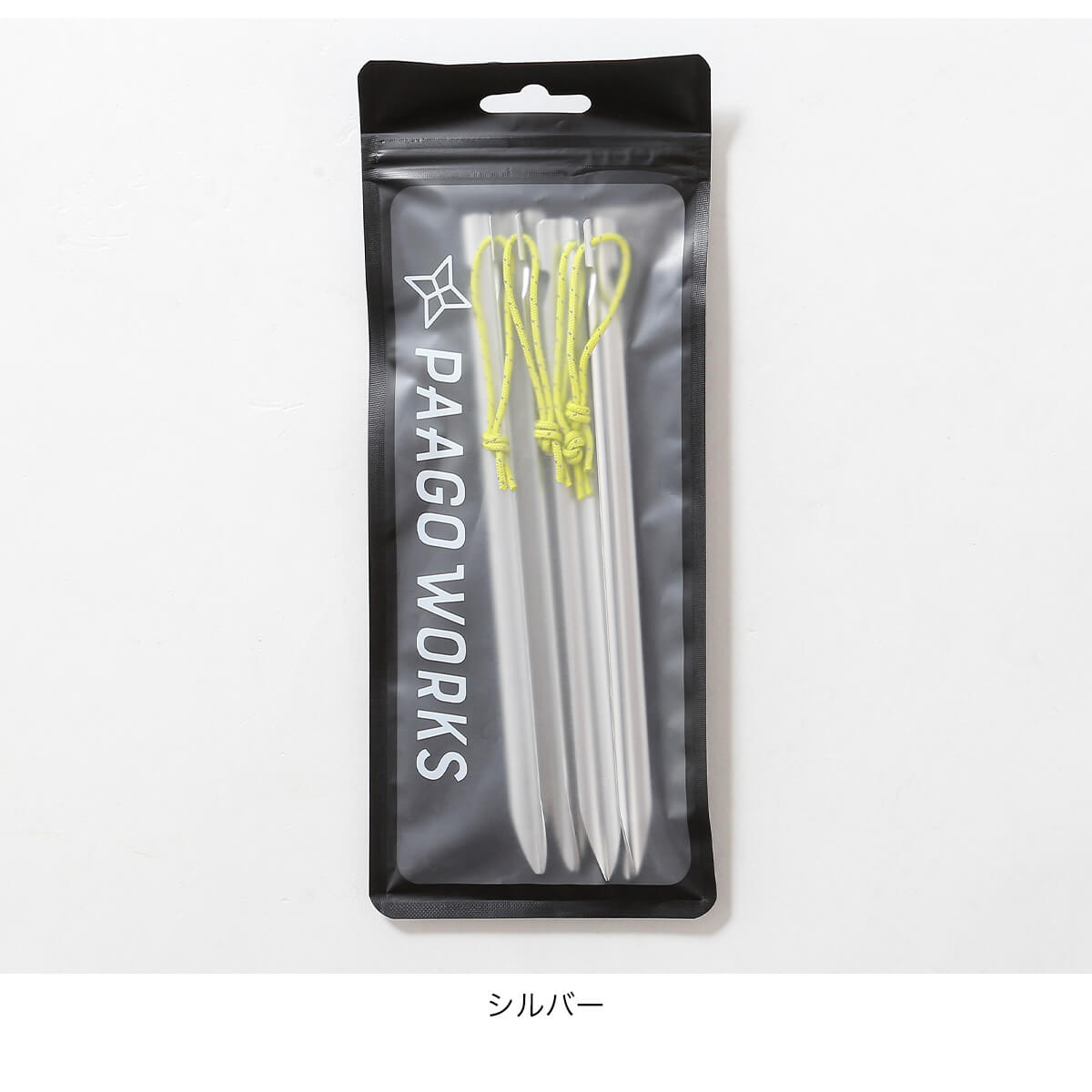 NINJA SHELTERに付属している、アルミニウム製のペグ4本セットです。鮮やかなグリーンのパラコード付きで、引き抜きやすいよう工夫されています。