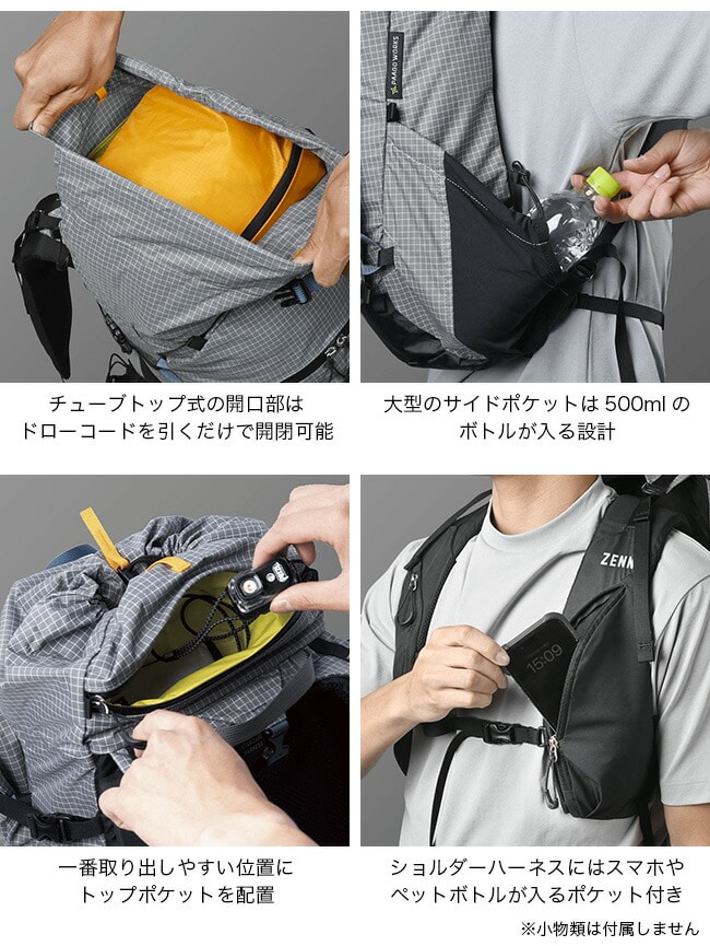 また、チューブトップ式の開口部はドローコードで素早く開閉可能。