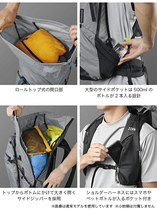 500mlボトルが2本入るサイドポケットや、スマホ・ボトル収納ができるショルダーハーネスポケットなど、使いやすさにもこだわりました。