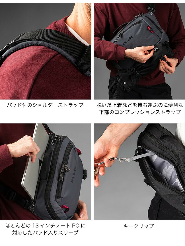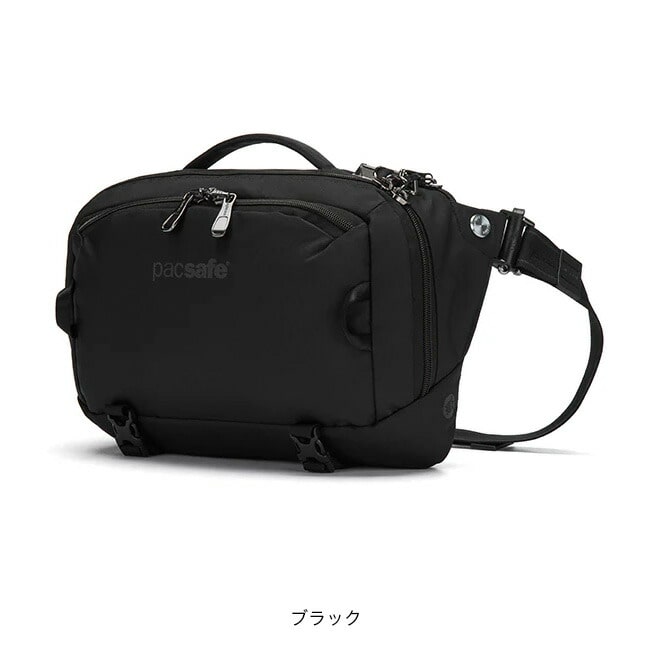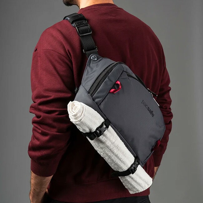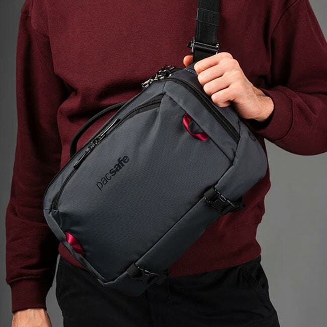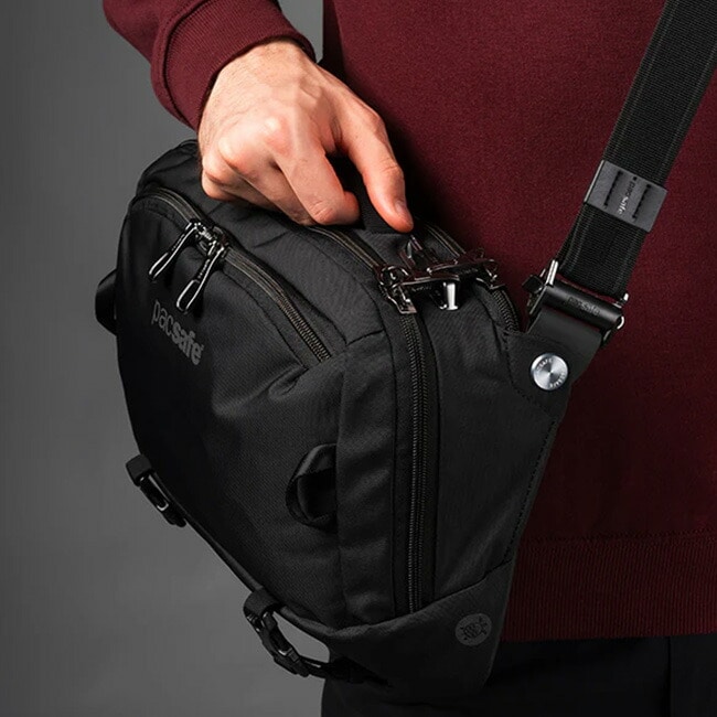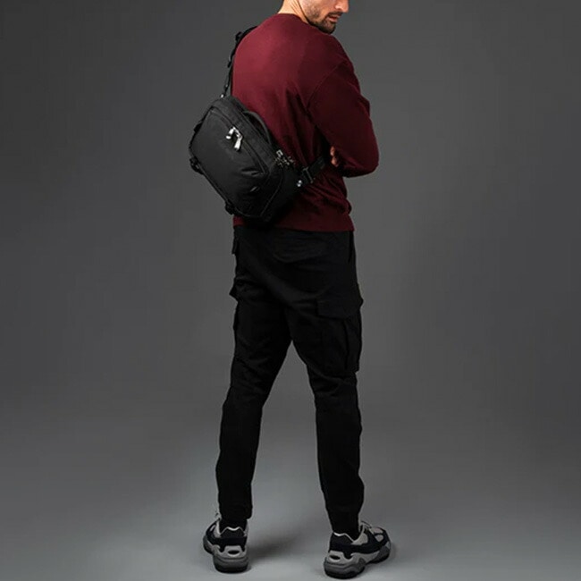 クロスボディバッグまたはスリングパックとして2通りの着用方法が可能な盗難防止機能付きのボディバッグです。