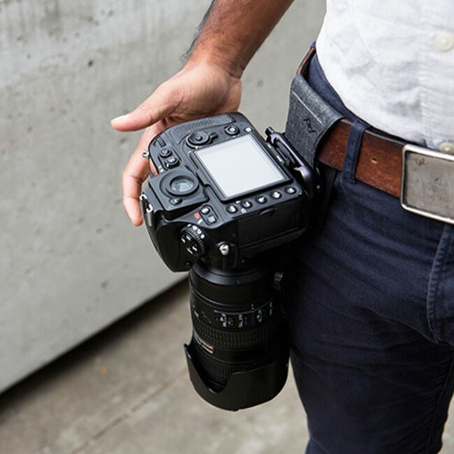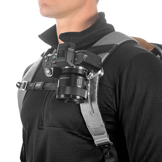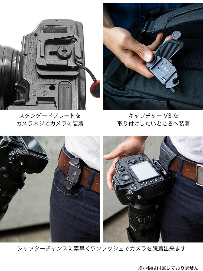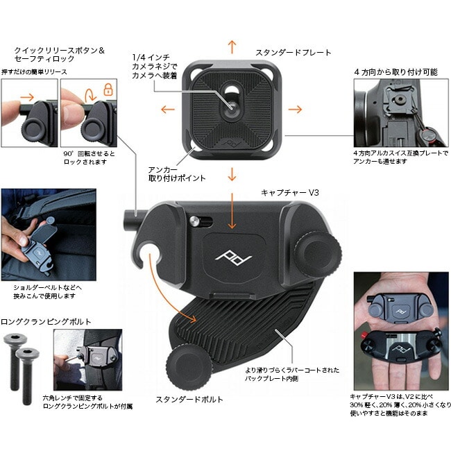 シャッターチャンスに素早くワンプッシュでカメラを脱着出来るクイックリリースプレート機構をもち、軽量コンパクトながらも確実にカメラをホールドします。キャプチャーV3は、V2に比べ30%軽量・20%薄く、20%低くなり、それでいて機能はそのままです。