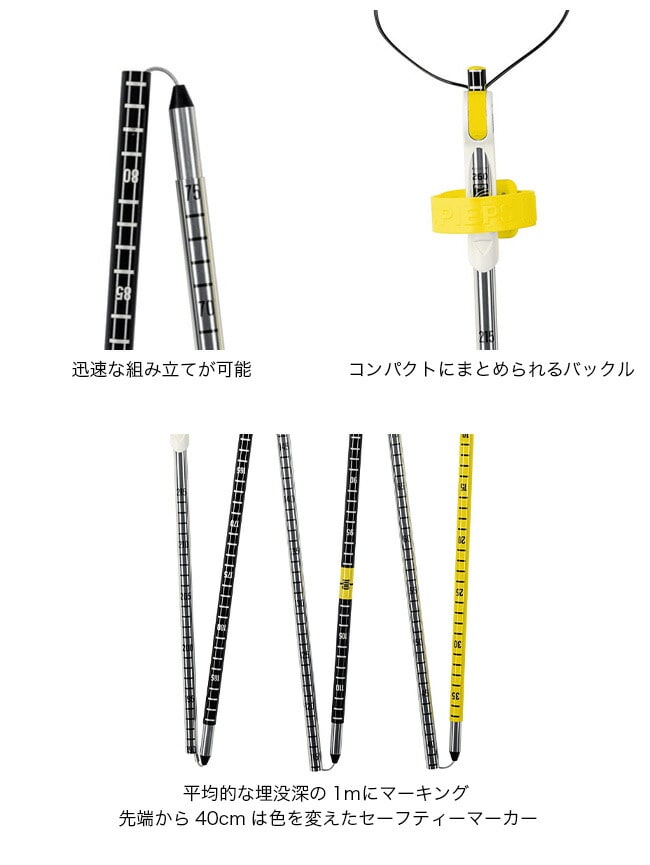 平均的な埋没深の1mにマーキング、先端から40cmは色を変えたセーフティーマーカーにすることで埋没者までの距離を視覚的に示します。
