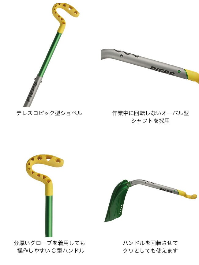 分厚いグローブを着用しても操作しやすいC型ハンドル、作業中に回転しないオーバル型シャフトを採用。また、クイックロックシステムによりボタンを押さずにハンドルとブレードを接続できます。