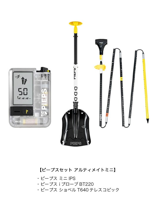 ミニIPSにiプローブBT220とシャフト伸縮式のT640ショベルを組み合わせたアバランチセーフティキット。