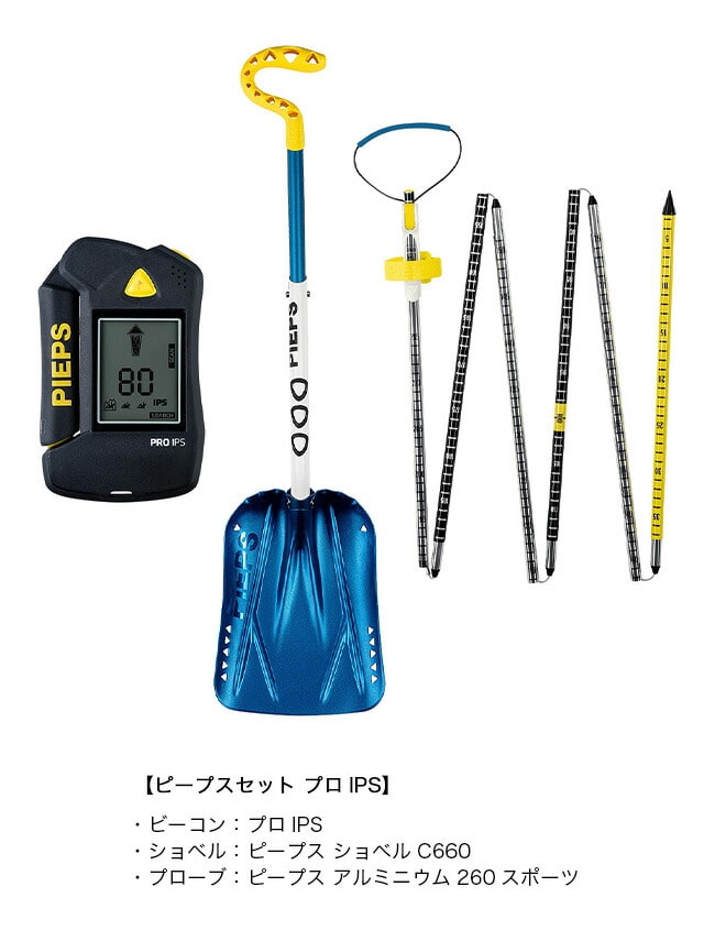 最も高機能な雪崩ビーコン・プロIPSに、分厚いミトンでも操作しやすいC字ハンドルのC660ショベル、堅牢なアルミニウム260スポーツプローブをセットにしたハイエンドキット。