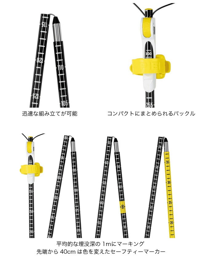 平均的な埋没深の1mにマーキング、先端から40cmは色を変えたセーフティーマーカーにすることで埋没者までの距離を視覚的に示します。