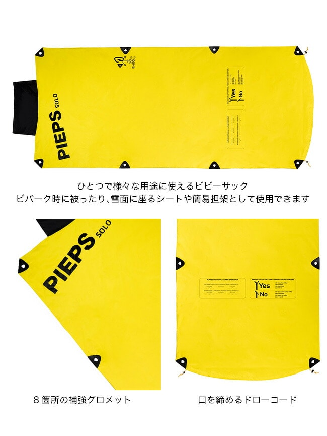 ビバーク時に被ったり、雪面に座るシートにしたり、簡易担架として使うことができます。ピープス ビビー ソロは1人用です。