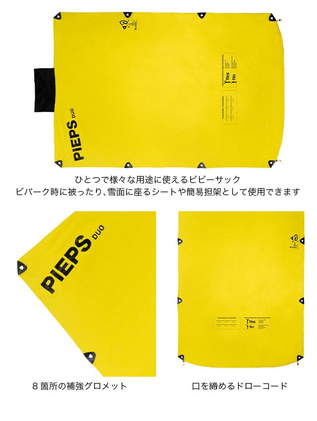 ビバーク時に被ったり、雪面に座るシートにしたり、簡易担架として使うことができます。ピープス ビビー デュオは2人用です。