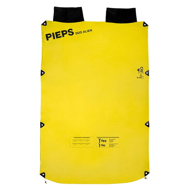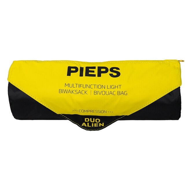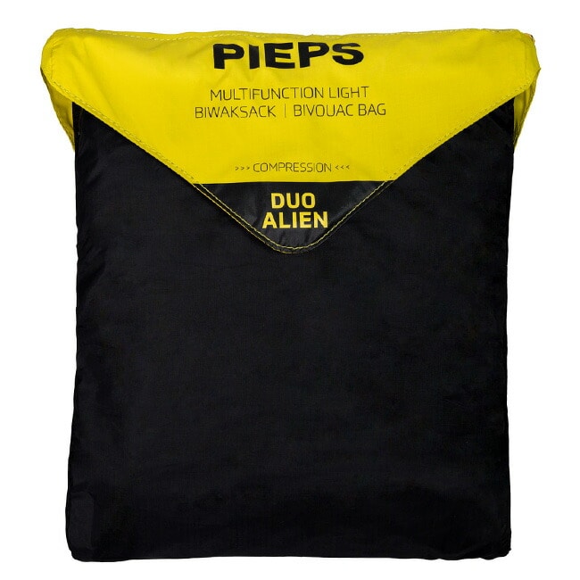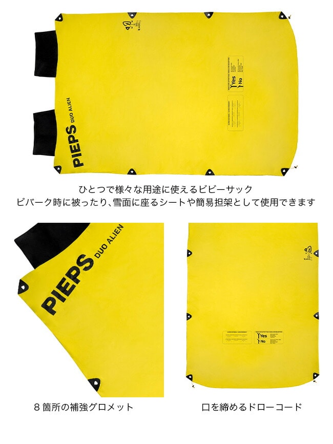 ビバーク時に被ったり、雪面に座るシートにしたり、簡易担架として使うことができます。ピープス ビビー デュオエイリアンは2人用で2人の頭が出せる仕様。