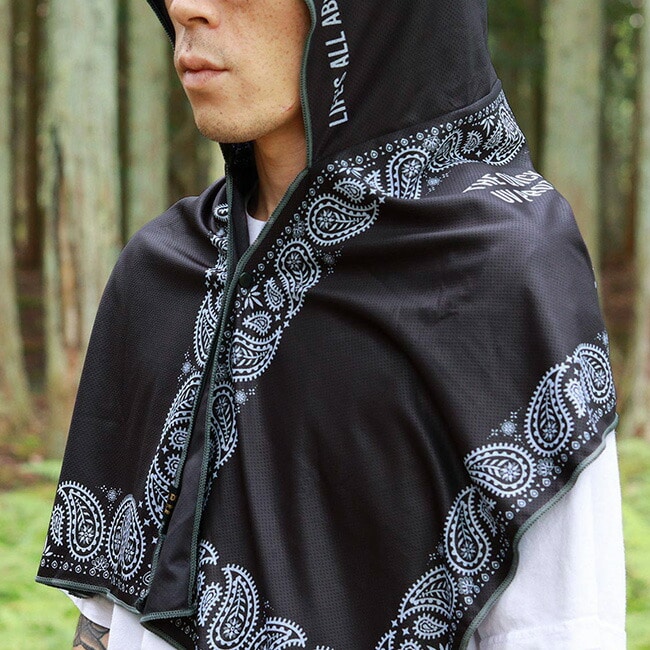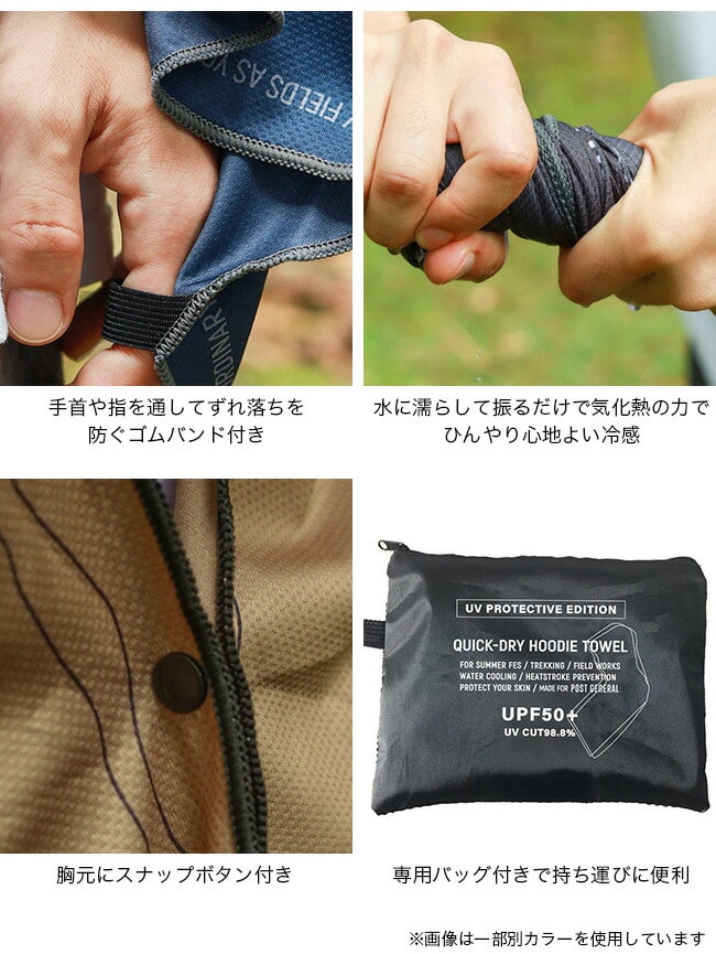気化熱の作用により、ひんやりとした冷感が得られるクーリング機能を備えたフーディタオルです。暑い季節でも快適な使い心地で、屋外シーンを心地よくサポートします。