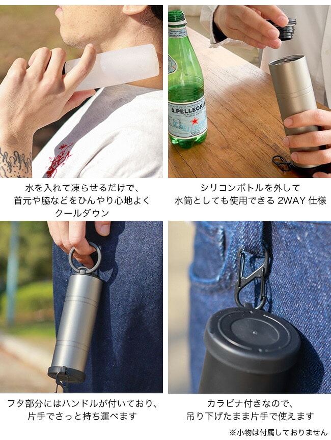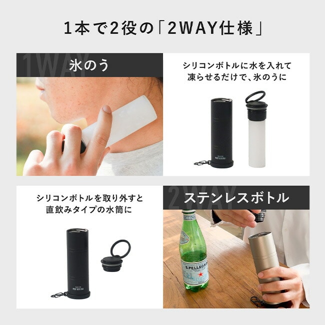 真空二重構造で、ひんやり感を長時間キープできるのも嬉しいポイント。シリコンボトルに水を入れて凍らせることで、氷嚢スティックとして持ち運びが可能。