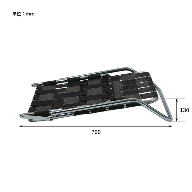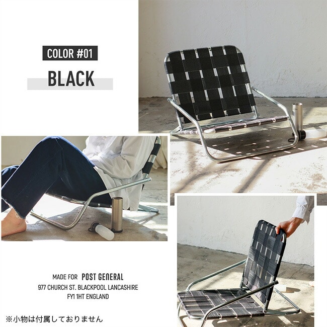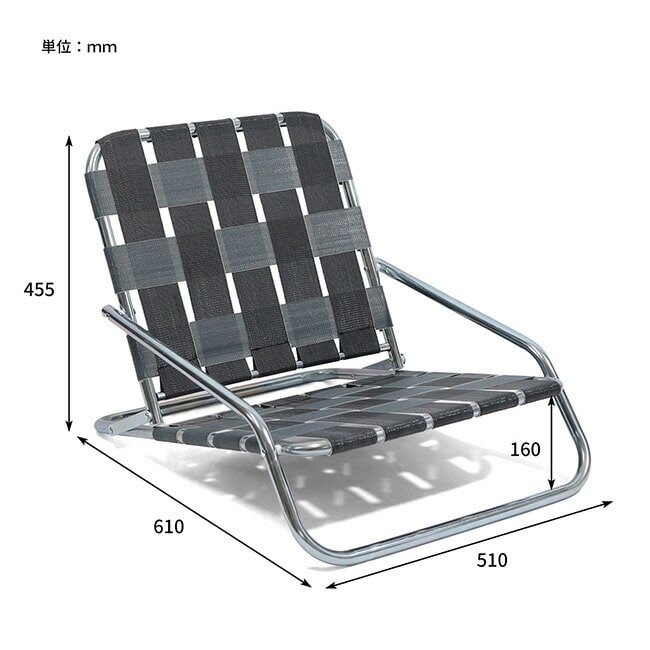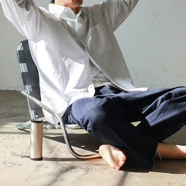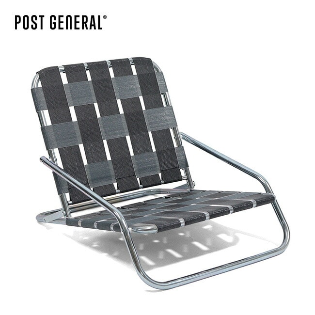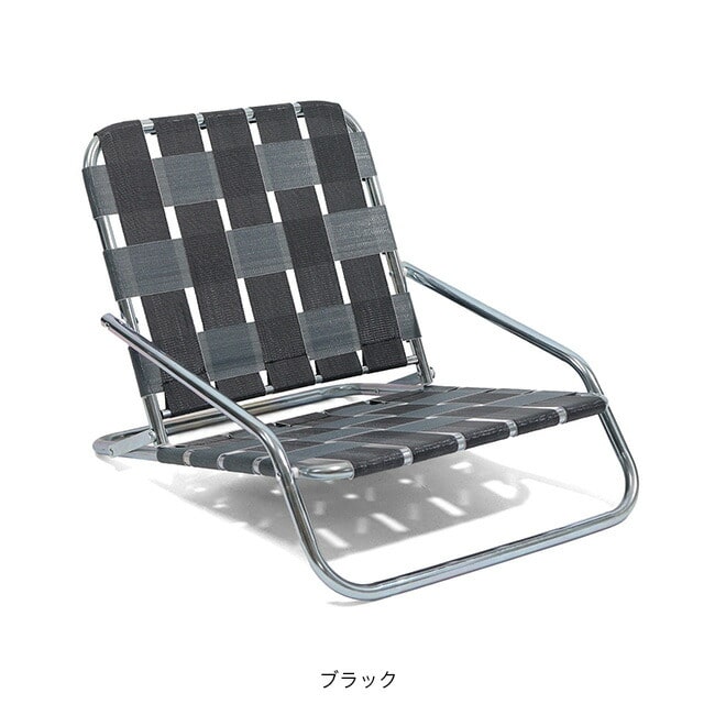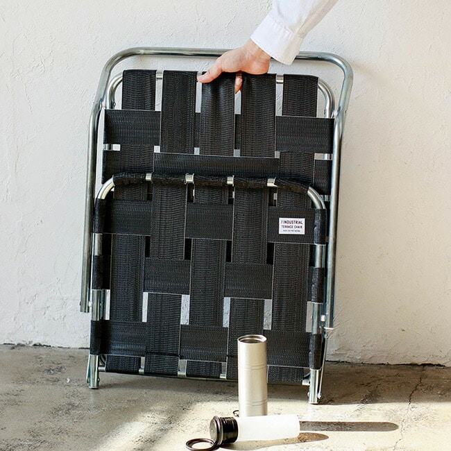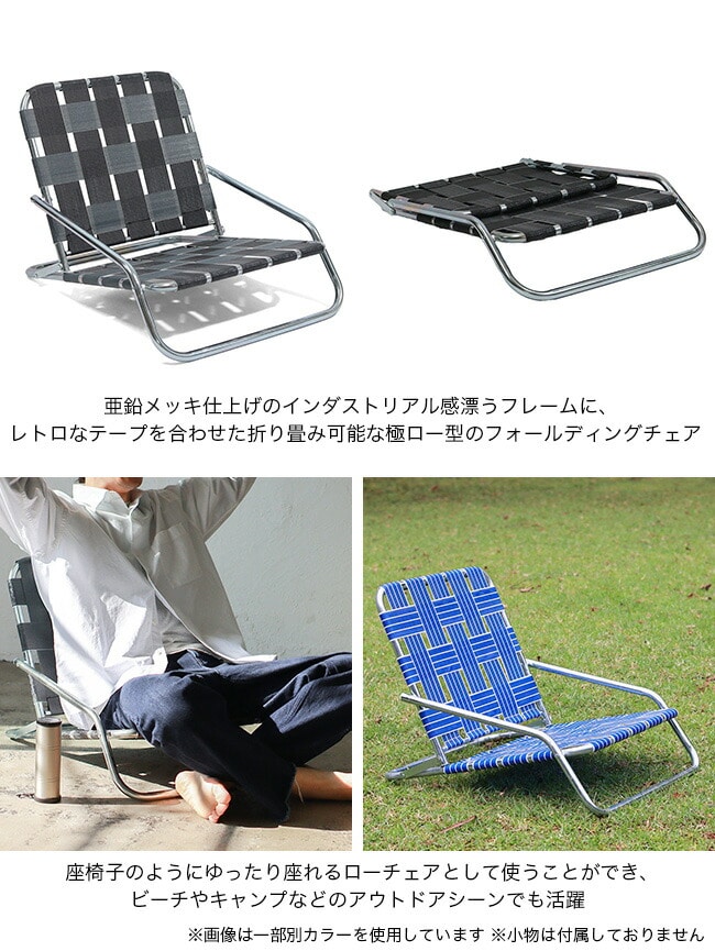 亜鉛メッキ仕上げのインダストリアル感漂うフレームに、レトロなテープを合わせた極ロー型のフォールディングチェア