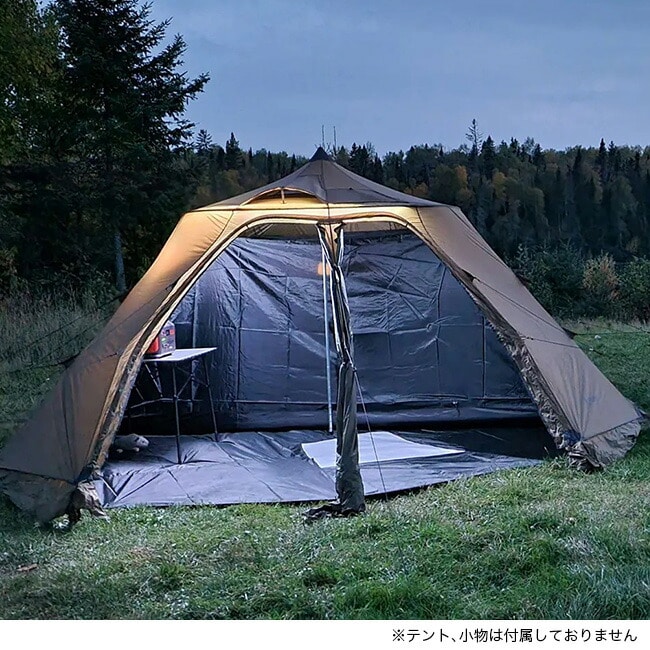 Circle 6のグランドシートは薪ストーブ専用に設計されています。ストーブジャックの真下に耐熱生地が入っているので、燃えている炭の火がフロアマットに落ちてもグランドシートが焦げることはありません。