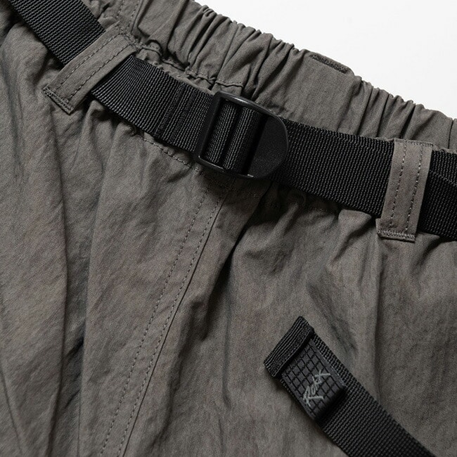 RPSパンツの特徴であるウェビングベルトを表に出したデザイン、独特のヒップ部分のパネルデザイン、極太なシルエットなど、ほかにないディティールが目を引くパンツ。