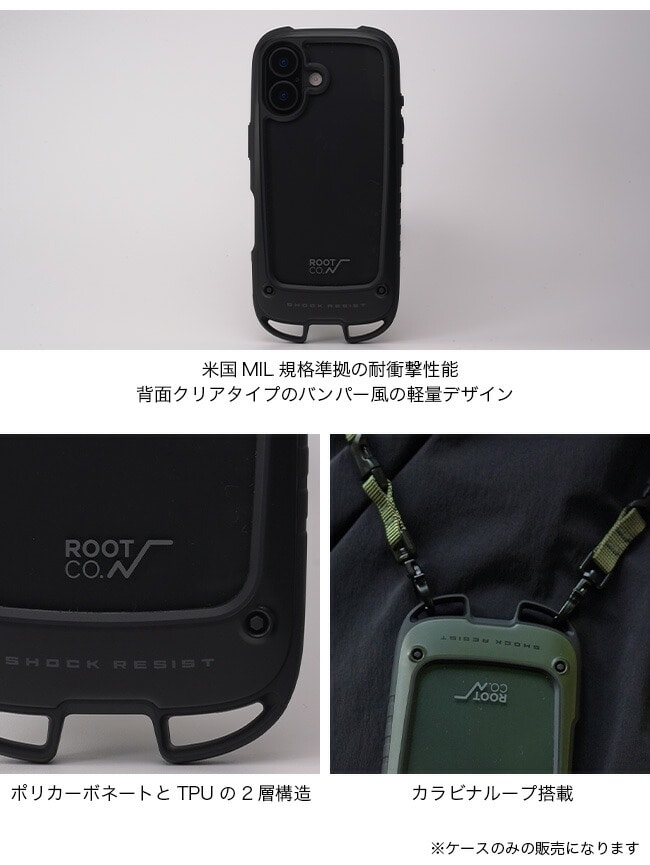 米国環境耐性試験「MIL-STD-810H 516.6Procedure Ⅳ」の耐衝撃試験に準拠した耐衝撃性能はもちろん、下部に搭載されたカラビナループにはカラビナなどを直接ケースに取り付ける事ができるので、バックパックやショルダーバッグ・ベルトループ等にiPhoneをそのまま装着、登山やアウトドア時の落下防止が可能です。デザインは、軽量&スリムさを実現した背面クリアのバンパータイプ。