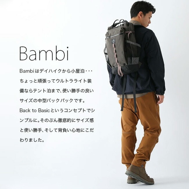 Bambiはデイハイクから小屋泊、ちょっと頑張ってUL装備ならテント泊まで、 使い勝手の良いサイズの中型バックパックです。