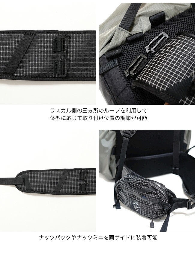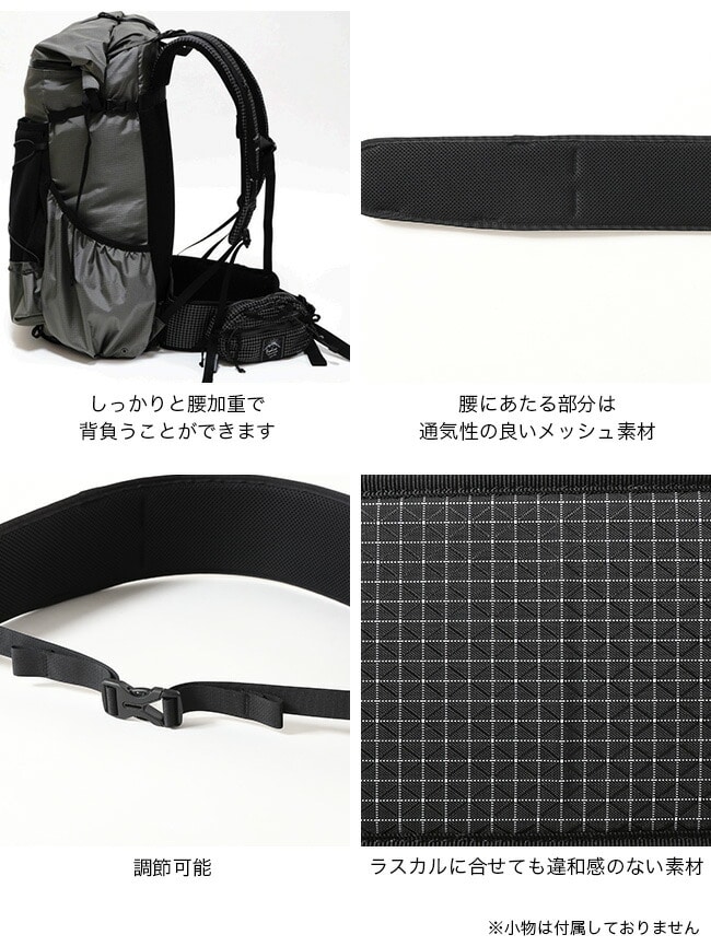 パッキングウェイト12kg∼程度から腰加重の必要性が出てくる方向けへ簡単にウエストハーネスを装着可能なオプションキットです。しっかりと腰加重で背負える様にラスカルをカスタムできます。