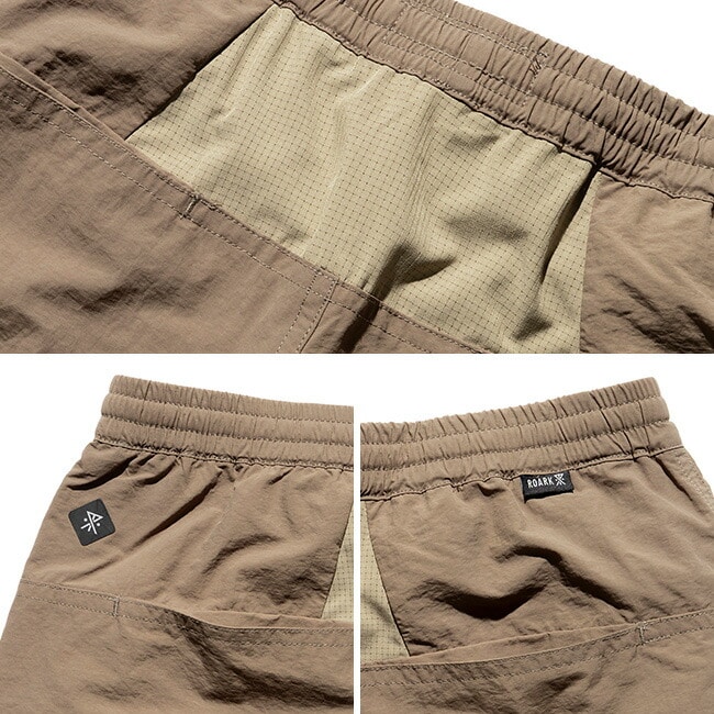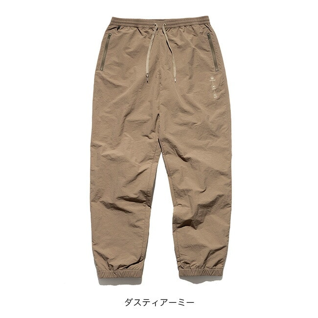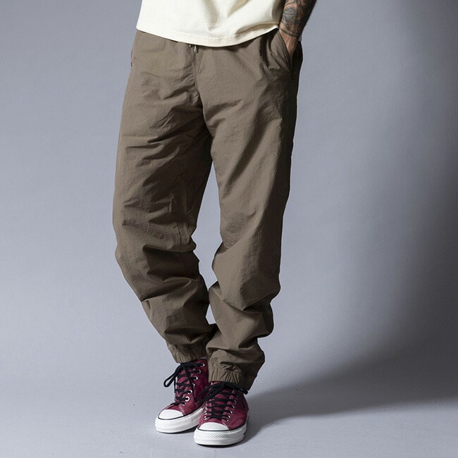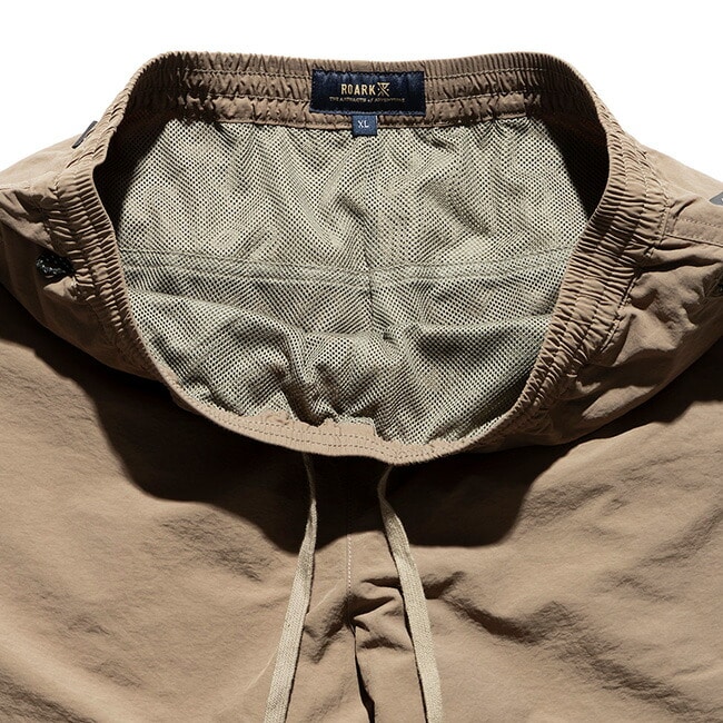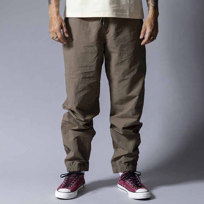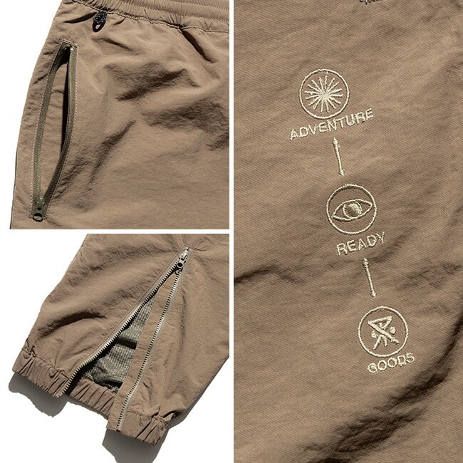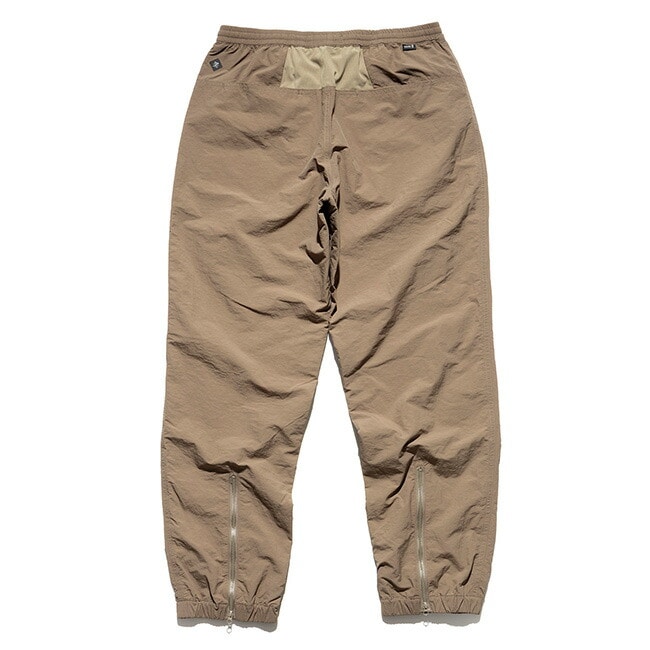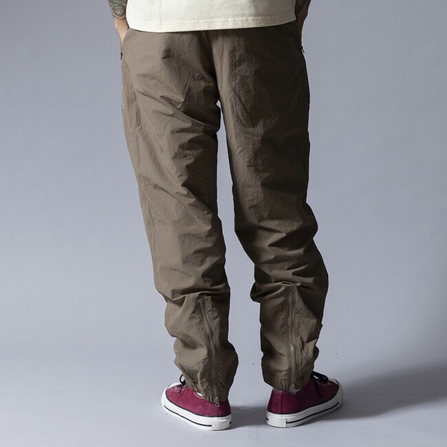 独特のシワ感と軽さのあるナイロン生地を使用し、裏地には通気性の高いメッシュを採用。サイドポケットと裾後に配置されたビスロンファスナーが特徴的です。
