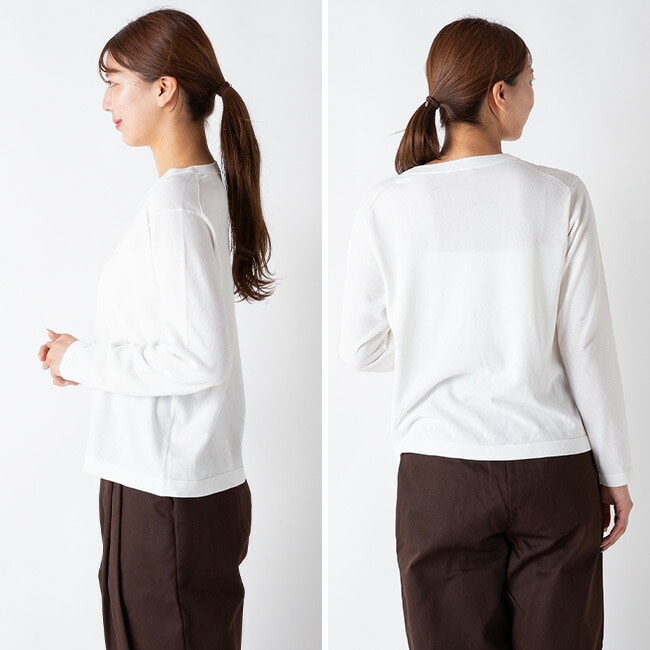 衿元の目立てや後ろ肩はニットの製法ならでは。