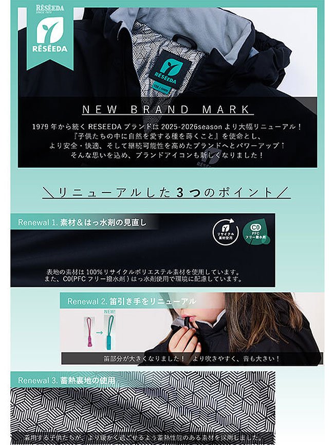 少し大きめサイズなのでスキーはもちろん、ボードにもピッタリです。RESEEDAではお子様の安全に考慮し、JIS規格に対応して作られています。