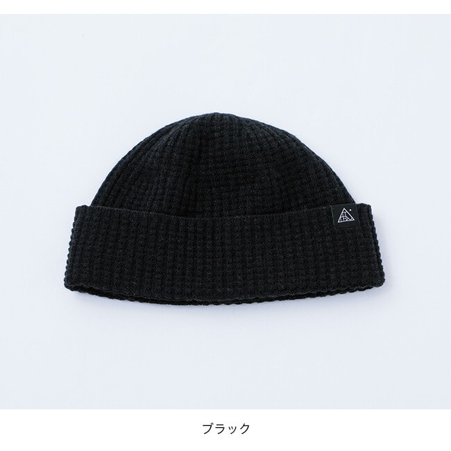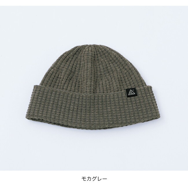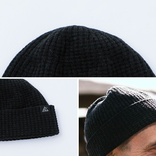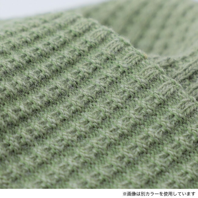 グリッドの凹凸のあるワッフル編でかぶり心地の良いフィット感。エクストラファインメリノと伸縮性のあるリサイクルポリエステルを一緒に編み込むことで強度を持たせつつ使い勝手のいい厚み感です。