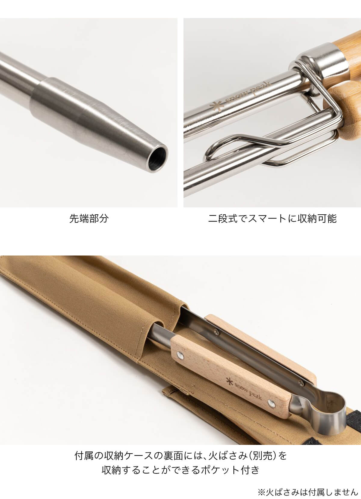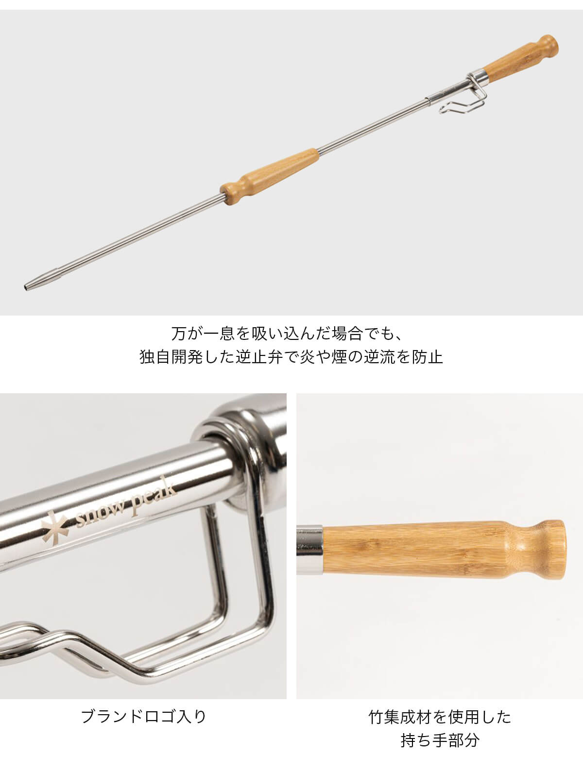 二段式でスマートに収納し持ち運ぶこともでき、万が一息を吸い込んだ場合でも、独自開発した逆止弁で炎や煙の逆流を防止。