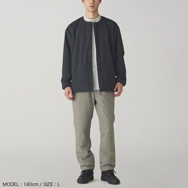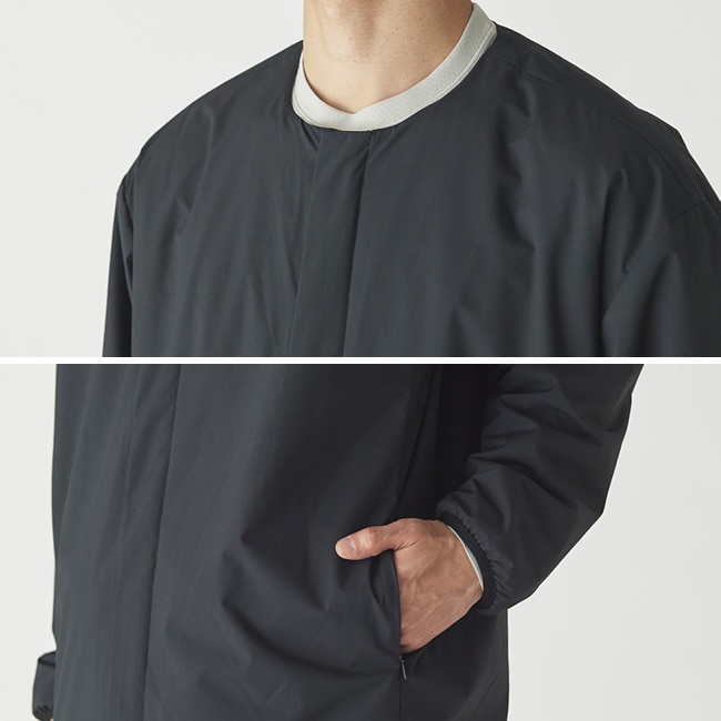 前立ては体温調整しやすく着こなしの幅を広げるダブルジップ仕様で、脇にはファスナー付きセキュリティポケットを配置。