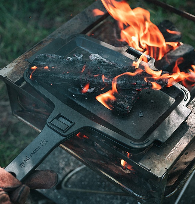焚火や炭火で豪快に調理を楽しめる深さのある鋳鉄製スキレット。