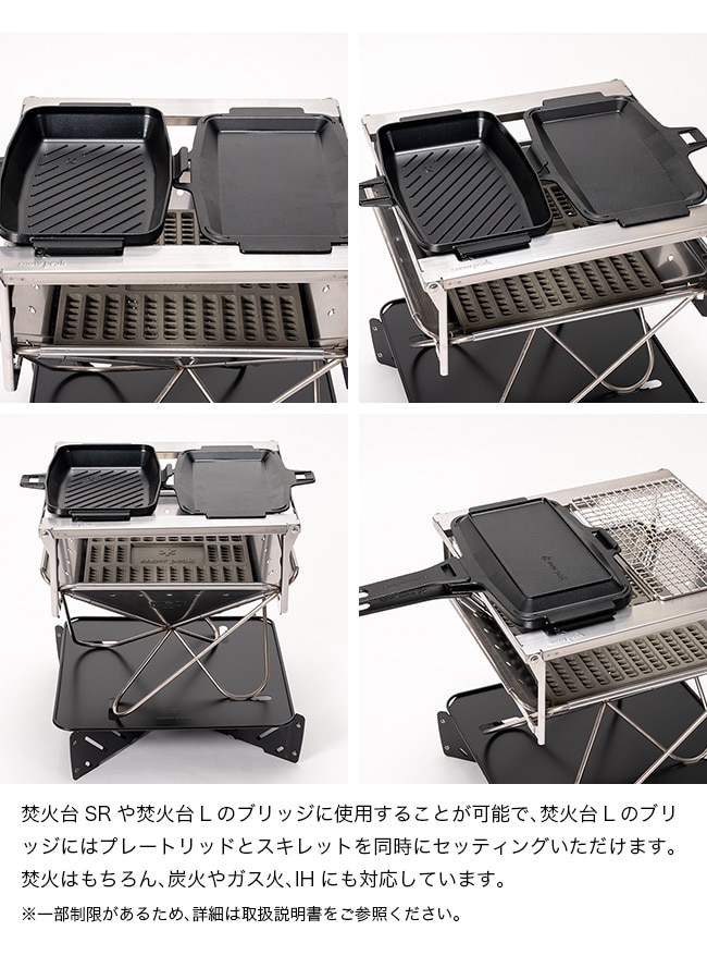 また、他製品と相性の良いよう規格サイズに設計されているため、焚火台SRや焚火台Lのブリッジに使用することが可能で、焚火台Lのブリッジにはプレートリッドとスキレットを同時にセッティングいただけます。