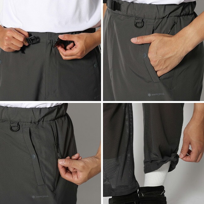 一枚穿きでもオーバーパンツでも着用でき、オーバーパンツでの着用時に下に穿いたパンツにもアクセスできるよう、脇にスルーポケットを配置しています。