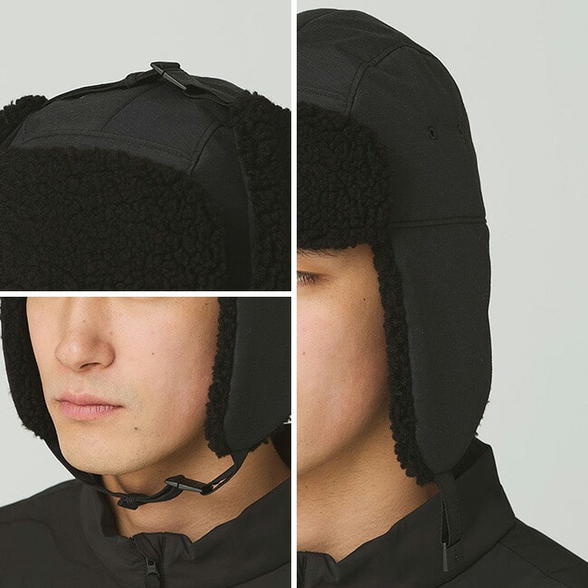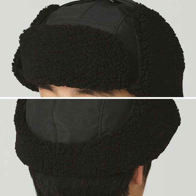 裏地には肌触りの良い起毛素材を使用し、耳当て部分には保温性の高いボアフリースを配置。