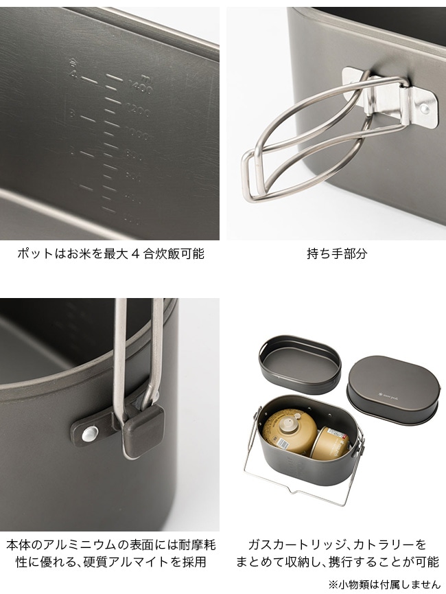 ガスカートリッジ、カトラリーをまとめて収納し、携行することができ、本体のアルミニウムの表面には耐摩耗性に優れる、硬質アルマイトを施しています。