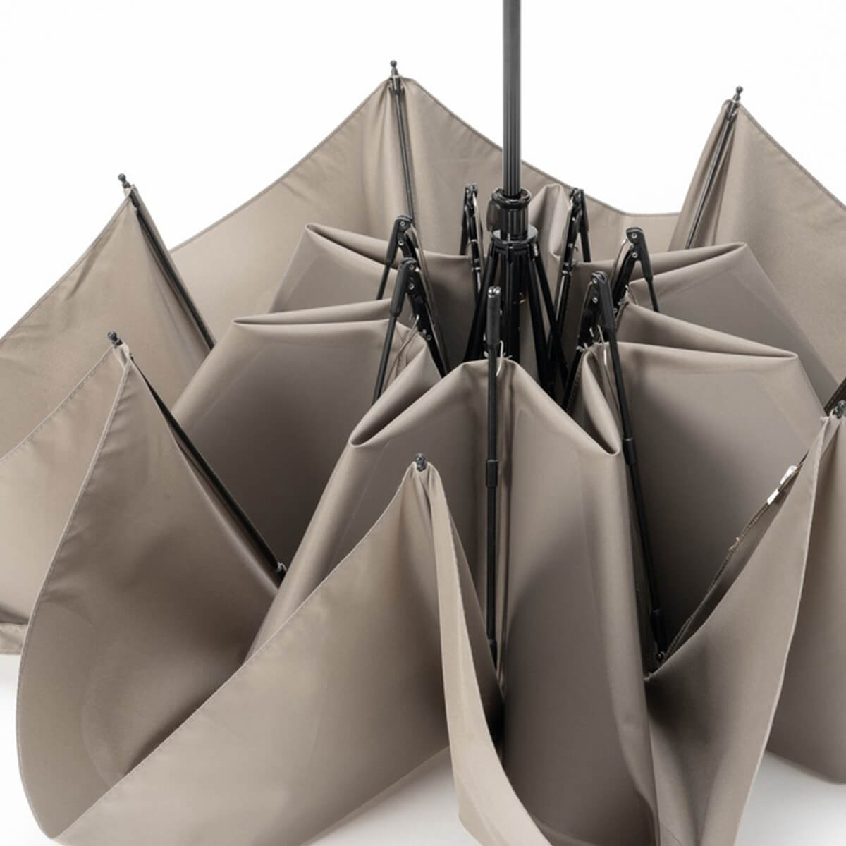 折り畳む手間や置き場所の問題を解決するために開発した、スマートで新しい折り畳み傘。生地の裏に折り畳みをサポートするペット樹脂のシートが貼り付けられており、一瞬でスムーズに折り畳むことが可能です。