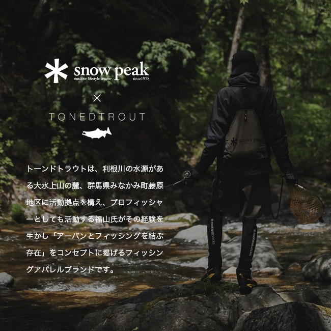福山氏のプロフィッシャーとしての知見を活かし、スノーピークのアイテムをベースに、トーンドトラウトが渓流フィッシングからインスパイアされた様々なアップデートを施した特別仕様です。