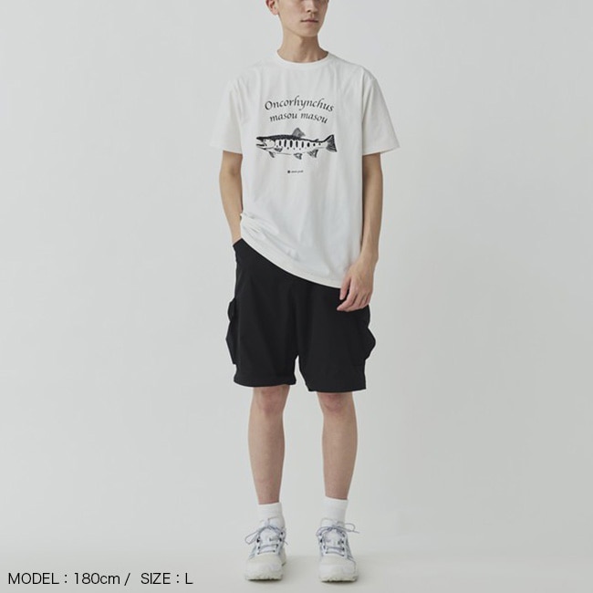 デザインはシンプルな半袖クルーネックタイプで、川魚の女王、渓の宝石とも言われる「山女魚」をモチーフとしたグラフィックが印象的なデザインです。