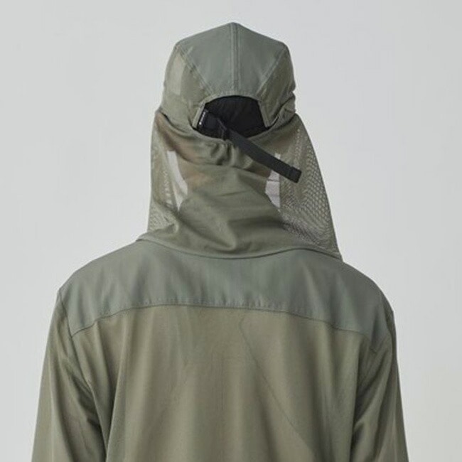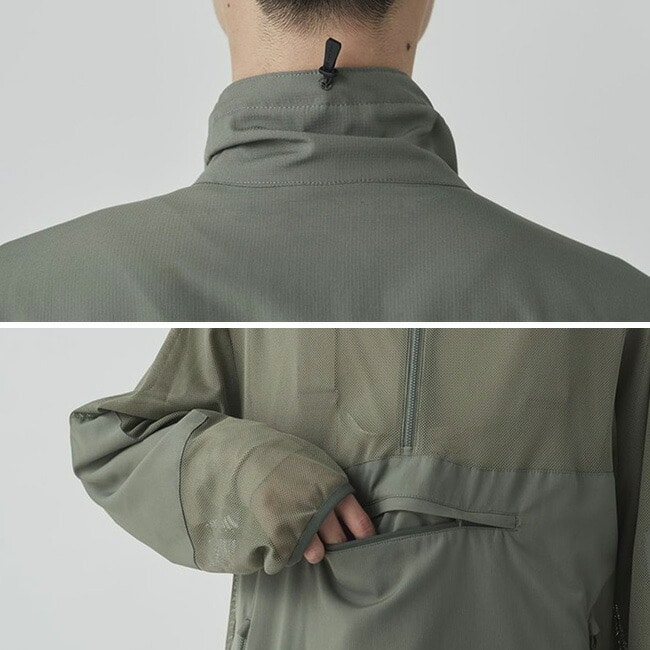 襟端のアジャスター調整で虫の侵入を防ぎ、袖口サムホール付きで手の甲までしっかりガード。