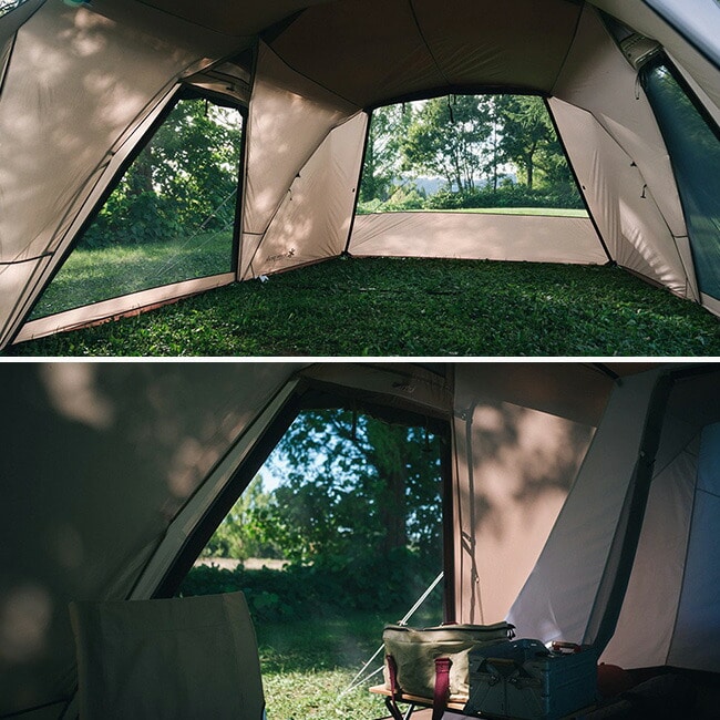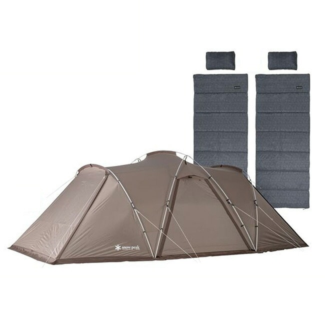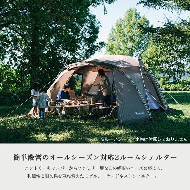 建てやすさと住居性を両立させた通年対応の2ルームシェルター「ランドネストシェルター」に、シュラフとピローがついたお得なセットです。ランドネストシェルターは、4面メッシュで風通しもよく、冬も安心のスカート付き。