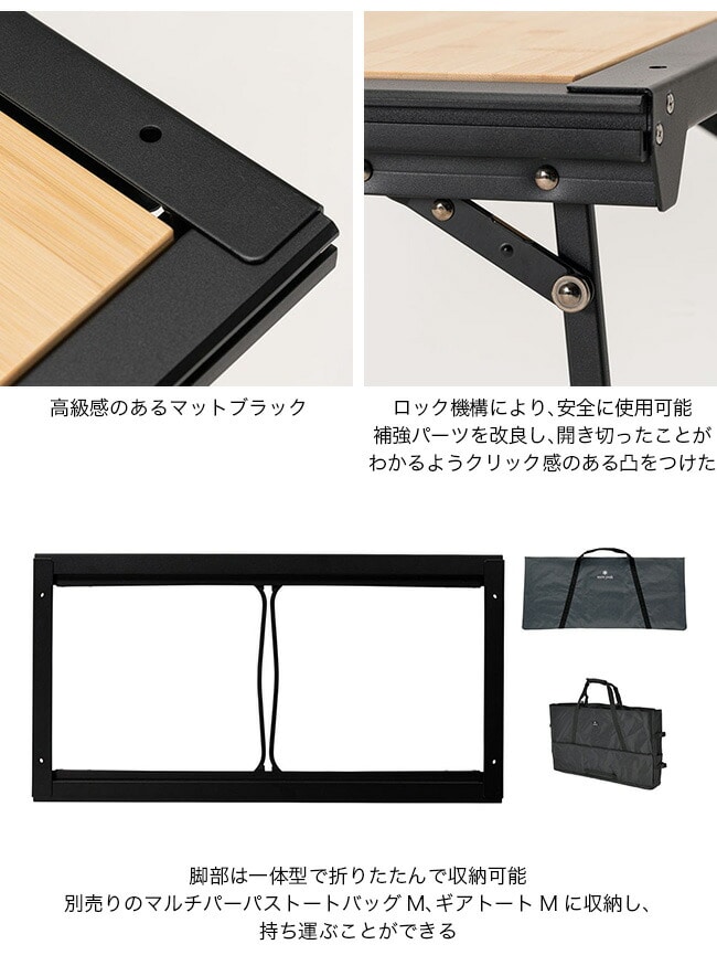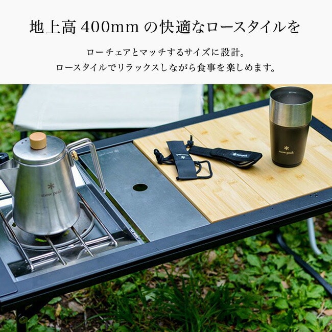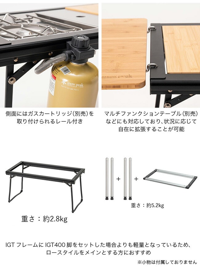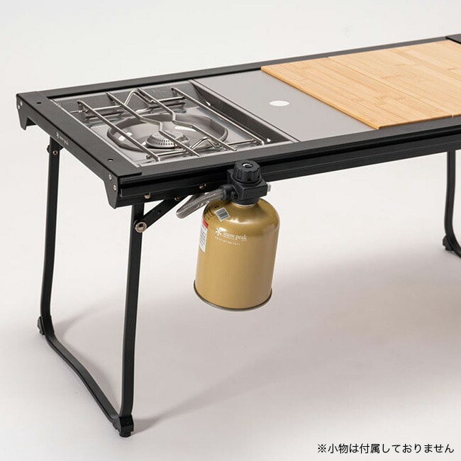 天板を外し、中に目的に合わせたバーナーやBBQ-BOXなどを自在にレイアウトできる、アイアングリルテーブルの機能を継承しながら、比較的手の届きやすい価格帯を実現した「エントリーIGT」にオンライン限定で粉体塗装を施したブラックカラーが登場。竹天板は1ユニットが2枚、ハーフユニットが2枚の合計3ユニット分がセットになっています。
