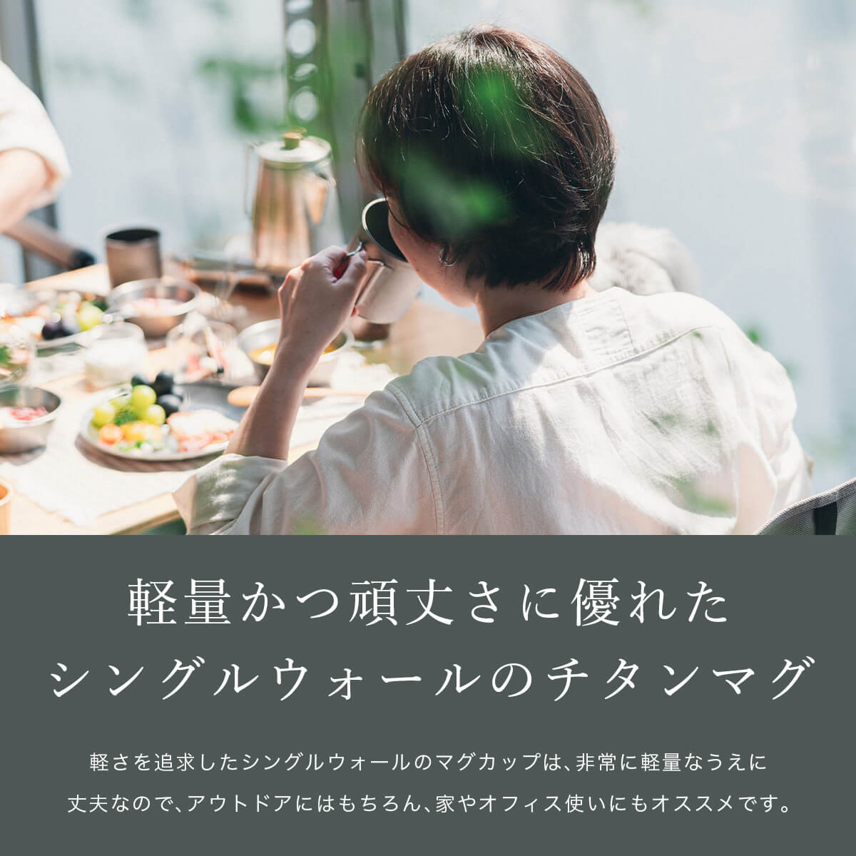 またチタニウムは軽量で熱伝導率が低いので熱の伝わりが鈍く、カップでは熱い飲みものを入れても口元が熱くなりづらいです。