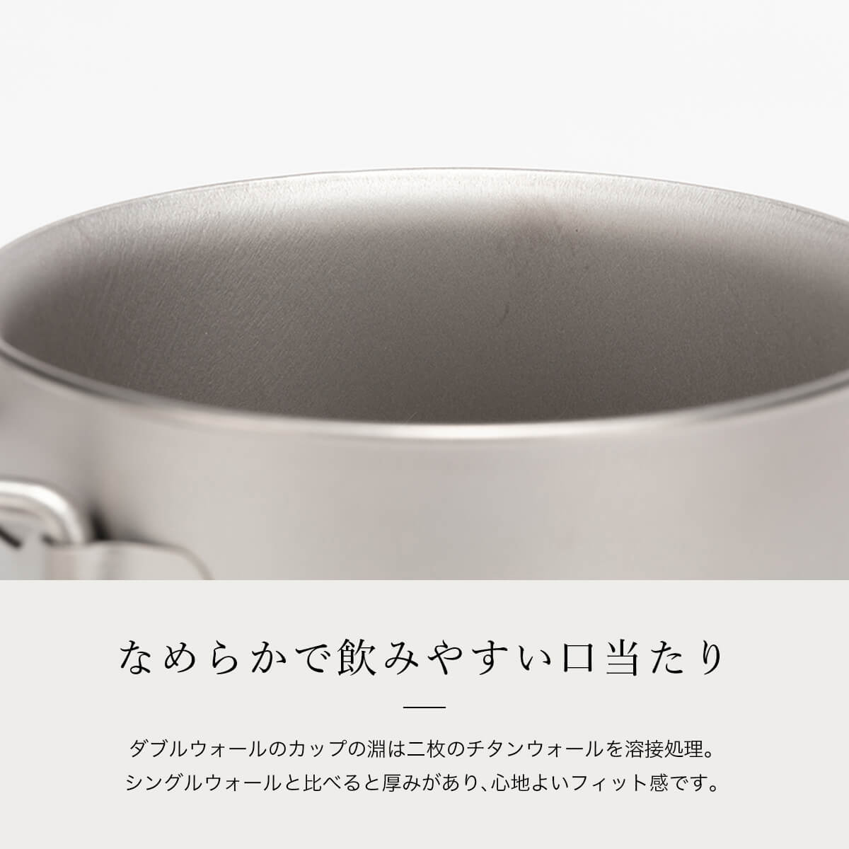ダブルウォールのカップの淵は二枚のチタンウォールを溶接処理しており、シングルウォールと比べると厚みがあり、心地よいフィット感です。