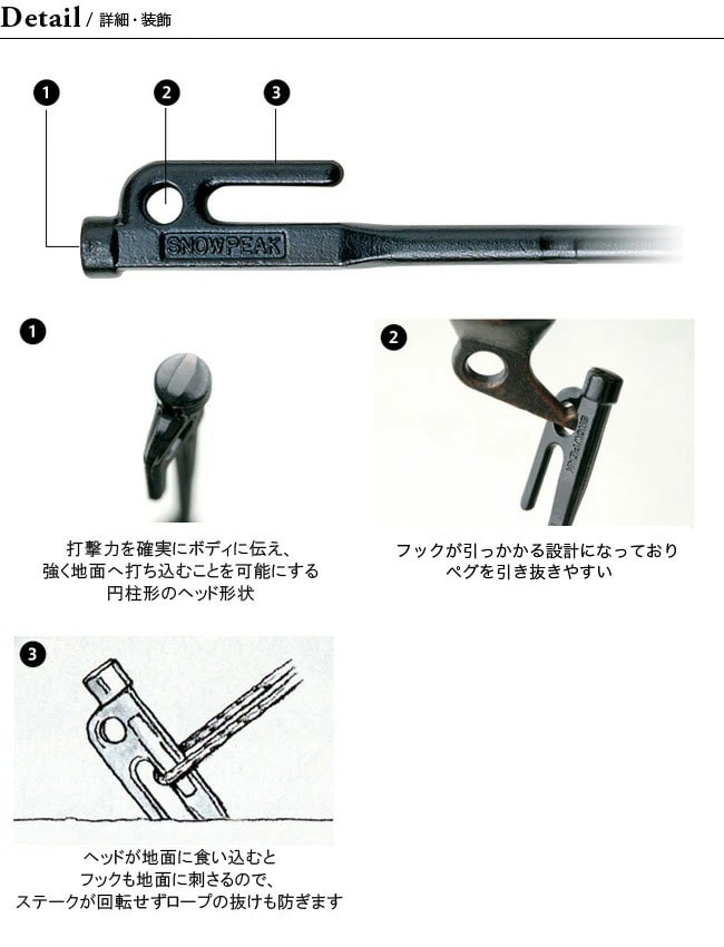 大きめのフック部分は、ヘッドが地面に食い込むとフックも地面に刺さるので、ステークが回転せずロープの抜けも防ぎます。